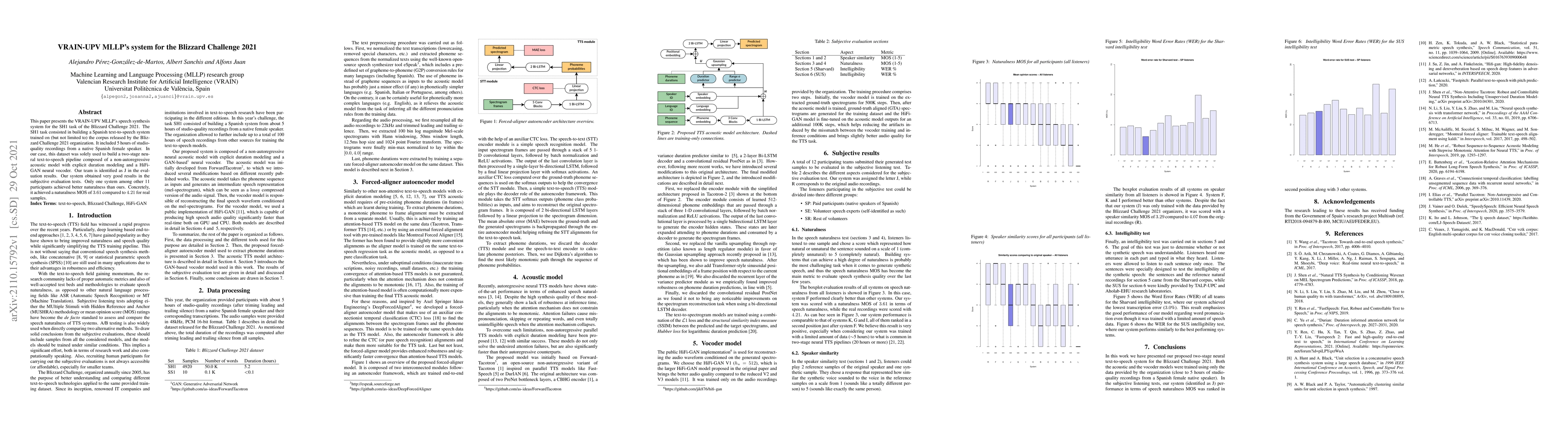This paper details VRAIN-UPV MLLP's Spanish text-to-speech system for the Blizzard Challenge 2021, featuring a two-stage neural pipeline with an acoustic model and HiFi-GAN vocoder, achieving high naturalness in subjective evaluations.
