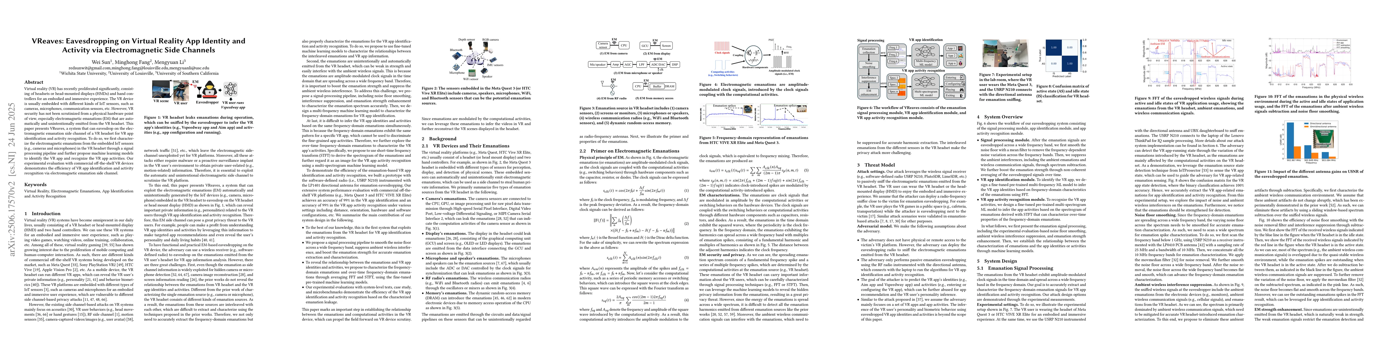 The paper introduces VReaves, a system that identifies VR apps and recognizes activities through electromagnetic emanations from VR headsets' IoT sensors. It uses signal processing and machine learning models, demonstrating effectiveness on commercial VR devices.