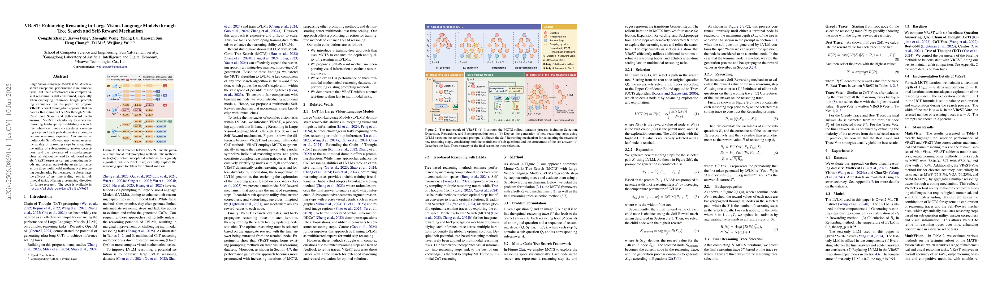 VReST enhances vision-language model reasoning through Monte Carlo tree search and self-reward mechanisms, surpassing current prompting methods and achieving state-of-the-art performance in multimodal mathematical reasoning.