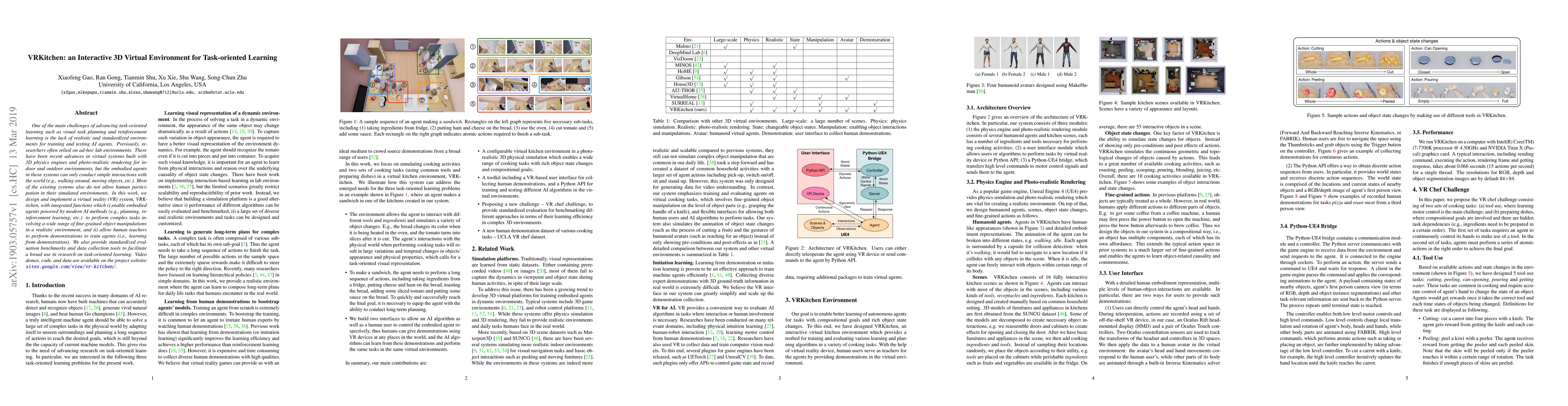 Researchers created a virtual reality system called VRKitchen to enable AI agents to perform complex tasks in realistic environments and allow humans to train them through demonstrations. This system aims to advance task-oriented learning methods by providing standardized evaluation benchmarks and data collection tools.