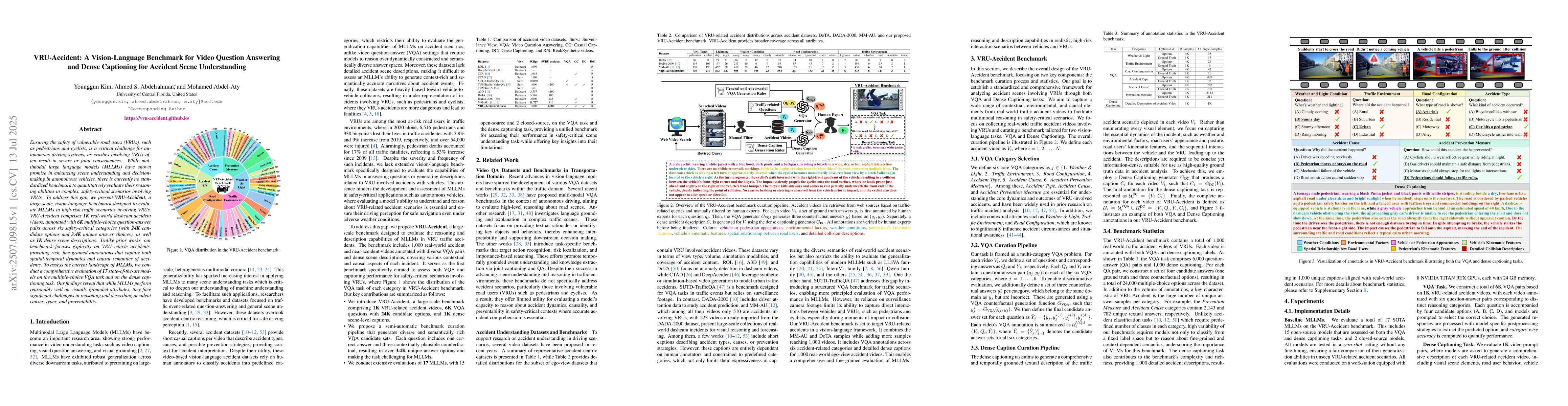 Ensuring the safety of vulnerable road users (VRUs), such as pedestrians and cyclists, is a critical challenge for autonomous driving systems, as crashes involving VRUs often result in severe or fatal consequences. While multimodal large language models (MLLMs) have shown promise in enhancing scene understanding and decision making in autonomous vehicles, there is currently no standardized benchmark to quantitatively evaluate their reasoning abilities in complex, safety-critical scenarios involving VRUs. To address this gap, we present VRU-Accident, a large-scale vision-language benchmark designed to evaluate MLLMs in high-risk traffic scenarios involving VRUs. VRU-Accident comprises 1K real-world dashcam accident videos, annotated with 6K multiple-choice question-answer pairs across six safety-critical categories (with 24K candidate options and 3.4K unique answer choices), as well as 1K dense scene descriptions. Unlike prior works, our benchmark focuses explicitly on VRU-vehicle accidents, providing rich, fine-grained annotations that capture both spatial-temporal dynamics and causal semantics of accidents. To assess the current landscape of MLLMs, we conduct a comprehensive evaluation of 17 state-of-the-art models on the multiple-choice VQA task and on the dense captioning task. Our findings reveal that while MLLMs perform reasonably well on visually grounded attributes, they face significant challenges in reasoning and describing accident causes, types, and preventability.