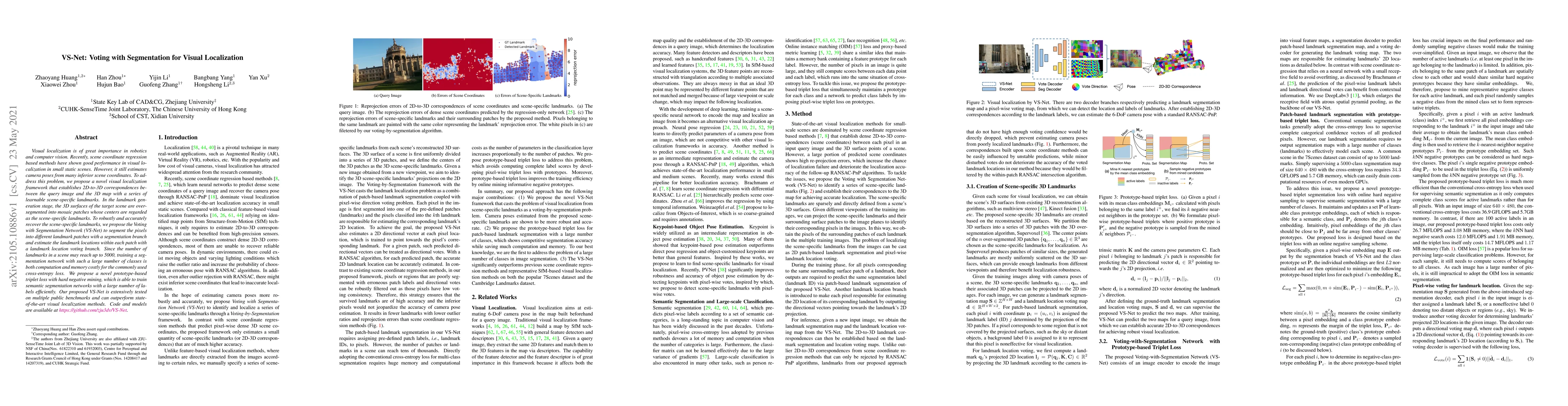 Visual localization is of great importance in robotics and computer vision. Recently, scene coordinate regression based methods have shown good performance in visual localization in small static scenes. However, it still estimates camera poses from many inferior scene coordinates. To address this problem, we propose a novel visual localization framework that establishes 2D-to-3D correspondences between the query image and the 3D map with a series of learnable scene-specific landmarks. In the landmark generation stage, the 3D surfaces of the target scene are over-segmented into mosaic patches whose centers are regarded as the scene-specific landmarks. To robustly and accurately recover the scene-specific landmarks, we propose the Voting with Segmentation Network (VS-Net) to segment the pixels into different landmark patches with a segmentation branch and estimate the landmark locations within each patch with a landmark location voting branch. Since the number of landmarks in a scene may reach up to 5000, training a segmentation network with such a large number of classes is both computation and memory costly for the commonly used cross-entropy loss. We propose a novel prototype-based triplet loss with hard negative mining, which is able to train semantic segmentation networks with a large number of labels efficiently. Our proposed VS-Net is extensively tested on multiple public benchmarks and can outperform state-of-the-art visual localization methods. Code and models are available at \href{https://github.com/zju3dv/VS-Net}{https://github.com/zju3dv/VS-Net}.