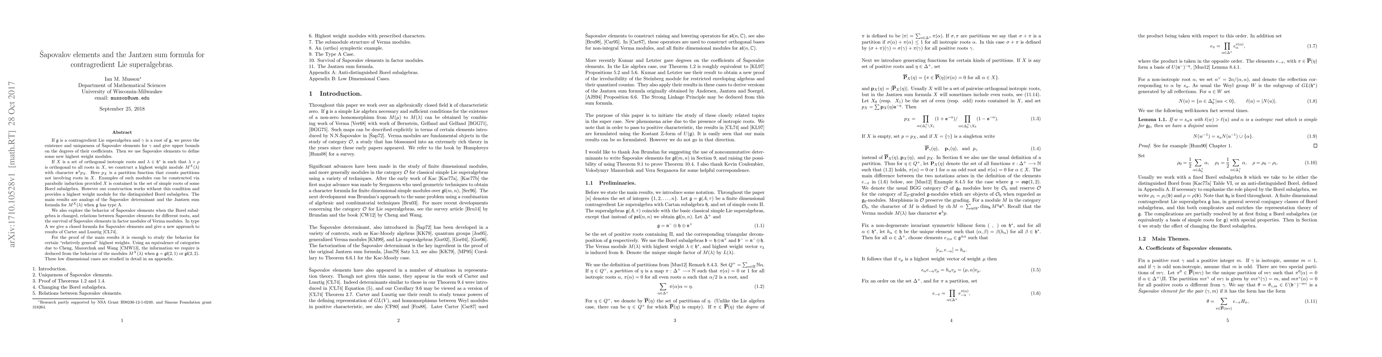 If $\mathfrak{g}$ is a contragredient Lie superalgebra and $\gamma$ is a root of $\mathfrak{g},$ we prove the existence and uniqueness of \v{S}apovalov elements for $\gamma$ and give upper bounds on the degrees of their coefficients. Then we use \v{S}apovalov elements to define some new highest weight modules. If $X$ is a set of orthogonal isotropic roots and $\lambda \in \mathfrak{h}^*$ is such that $\lambda +\rho$ is orthogonal to all roots in $X$, we construct a highest weight module $M^X(\lambda)$ with character $\epsilon^\lambda {p}_X$. Here $p_X$ is a function that counts partitions not involving roots in $X$. Examples of such modules can be constructed via parabolic induction provided $X$ is contained in the set of simple roots of some Borel subalgebra. However our construction works without this condition and provides a highest weight module for the distinguished Borel subalgebra. The main results are analogs of the \v{S}apovalov determinant and the Jantzen sum formula for $M^X(\lambda)$ when $\mathfrak{g}$ has type A.For the proof it is enough to study the behavior for certain "relatively general" highest weights. Using an equivalence of categories due to Cheng, Mazorchuk and Wang, the information we require is deduced from the behavior of the modules $M^X(\lambda)$ when $\mathfrak{g}=\mathfrak{gl}(2,1)$ or $\mathfrak{gl}(2,2)$. These low dimensional cases are studied in detail in an appendix.