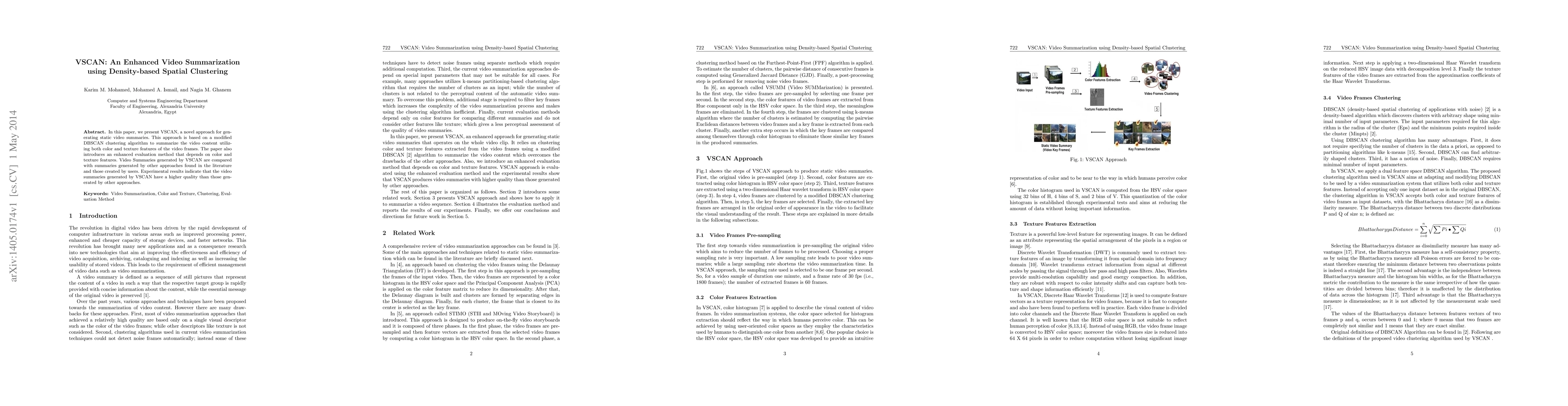 In this paper, we present VSCAN, a novel approach for generating static video summaries. This approach is based on a modified DBSCAN clustering algorithm to summarize the video content utilizing both color and texture features of the video frames. The paper also introduces an enhanced evaluation method that depends on color and texture features. Video Summaries generated by VSCAN are compared with summaries generated by other approaches found in the literature and those created by users. Experimental results indicate that the video summaries generated by VSCAN have a higher quality than those generated by other approaches.