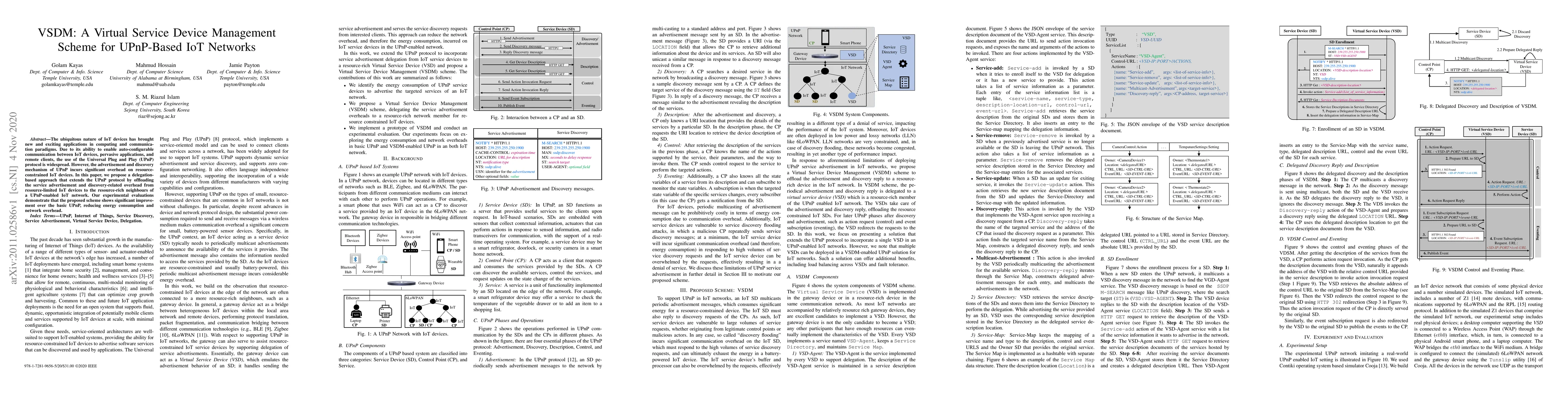 Title: VSDM: A Virtual Service Device Management Scheme for UPnP-Based IoT Networks Summary: This paper proposes VSDM, a delegation-based approach to extend UPnP, which offloads service advertisement and discovery tasks from resource-constrained IoT devices to resource-rich neighbors, significantly reducing energy consumption and network overhead.