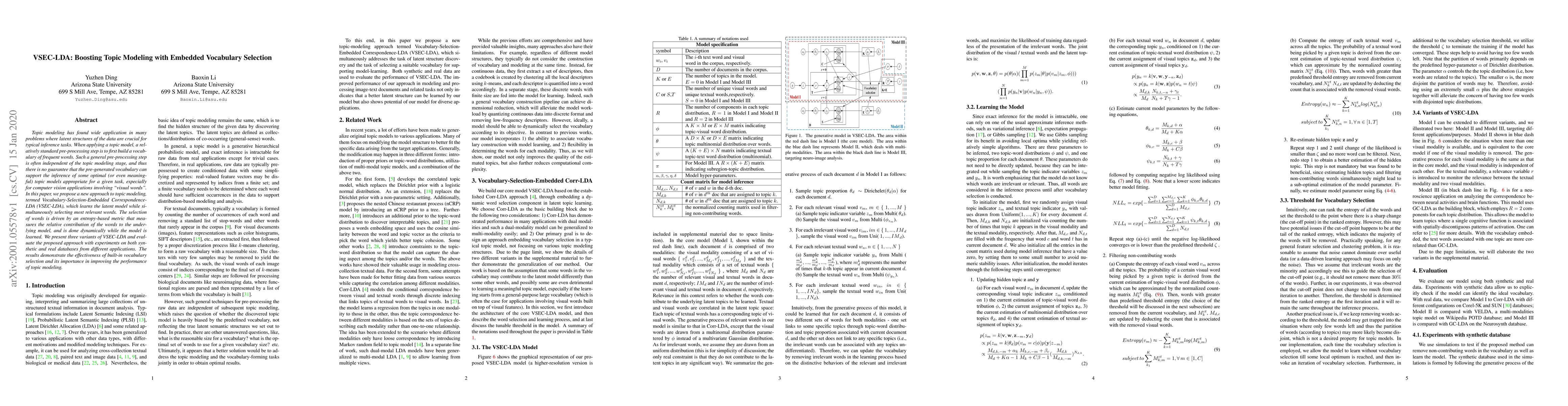 Topic modeling has found wide application in many problems where latent structures of the data are crucial for typical inference tasks. When applying a topic model, a relatively standard pre-processing step is to first build a vocabulary of frequent words. Such a general pre-processing step is often independent of the topic modeling stage, and thus there is no guarantee that the pre-generated vocabulary can support the inference of some optimal (or even meaningful) topic models appropriate for a given task, especially for computer vision applications involving "visual words". In this paper, we propose a new approach to topic modeling, termed Vocabulary-Selection-Embedded Correspondence-LDA (VSEC-LDA), which learns the latent model while simultaneously selecting most relevant words. The selection of words is driven by an entropy-based metric that measures the relative contribution of the words to the underlying model, and is done dynamically while the model is learned. We present three variants of VSEC-LDA and evaluate the proposed approach with experiments on both synthetic and real databases from different applications. The results demonstrate the effectiveness of built-in vocabulary selection and its importance in improving the performance of topic modeling.
