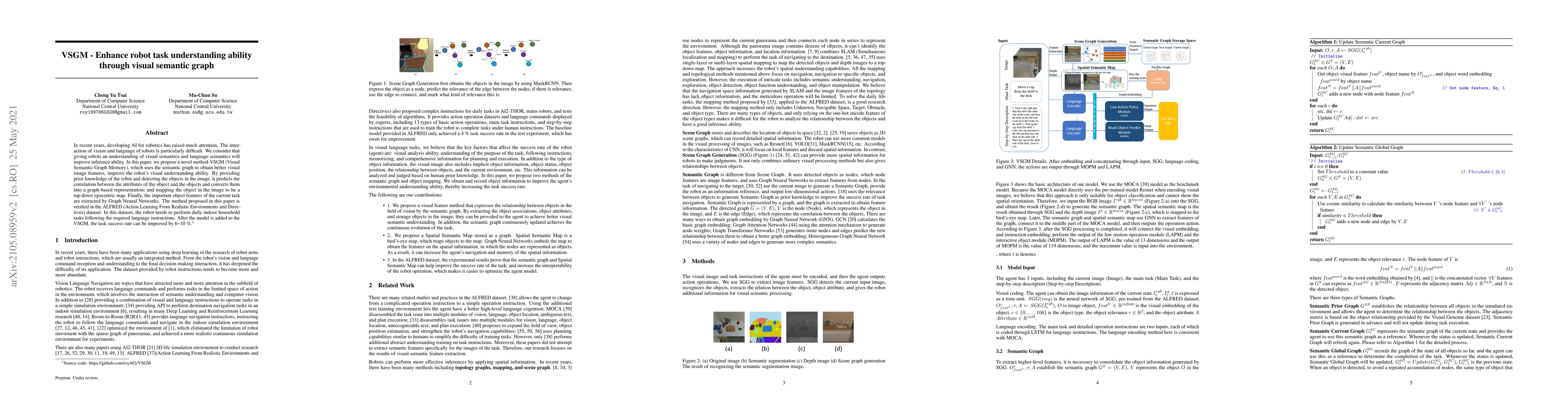 The paper proposes VSGM, a method that enhances a robot's task understanding through visual semantic graphs, improving its visual inference ability by mapping objects to a graph-based representation and extracting important features using Graph Neural Networks. The method shows a 6~10% increase in task success rate on the ALFRED dataset.