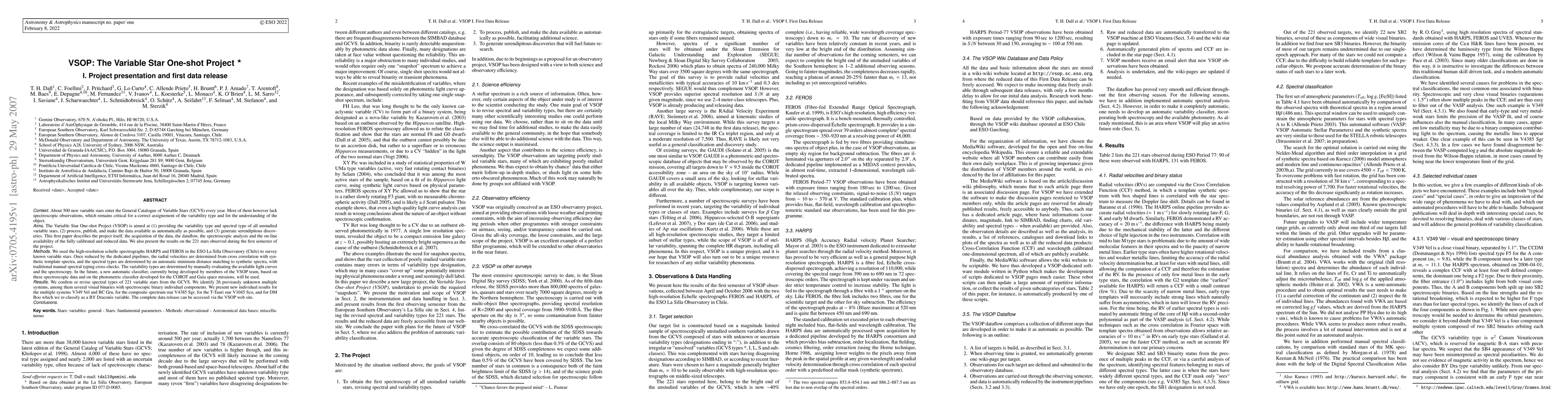 The Variable Star One-shot Project (VSOP) aims to classify unstudied variable stars and make data available automatically. The first paper details the project's methodology, data acquisition, and initial results on 221 stars, confirming or revising spectral types and identifying new multiple systems.