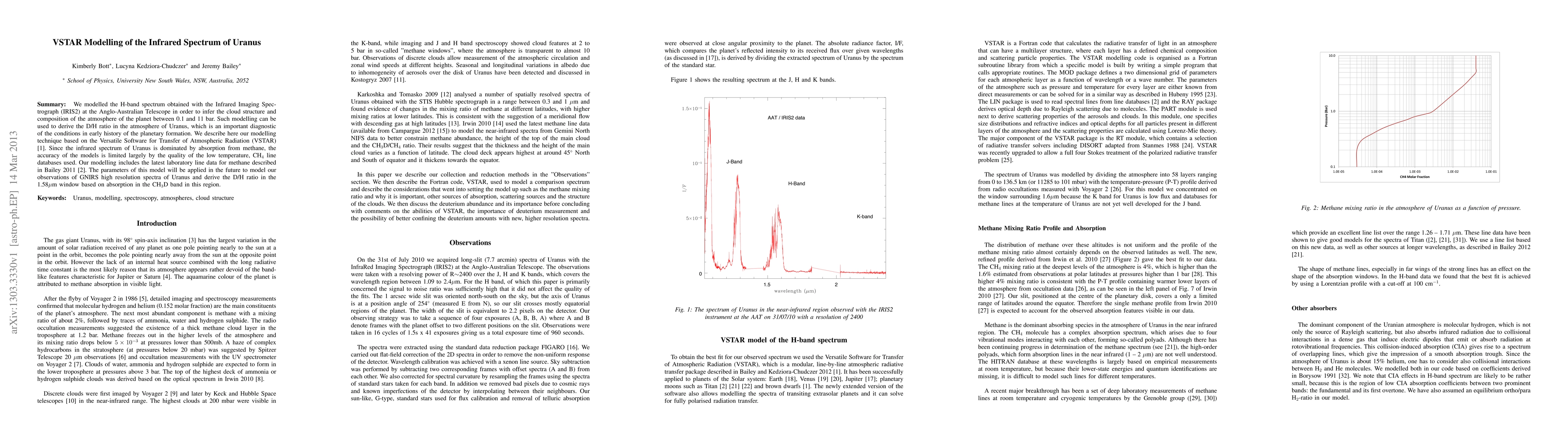 We modelled the H-band spectrum obtained with the Infrared Imaging Spectrograph (IRIS2) at the Anglo-Australian Telescope in order to infer the cloud structure and composition of the atmosphere of the planet between 0.1 and 11 bar. Such modelling can be used to derive the D/H ratio in the atmosphere of Uranus, which is an important diagnostic of the conditions in early history of the planetary formation. We describe here our modelling technique based on the Versatile Software for Transfer of Atmospheric Radiation (VSTAR) (Bailey2012a). Since the infrared spectrum of Uranus is dominated by absorption from methane, the accuracy of the models is limited largely by the quality of the low temperature, methane line databases used. Our modelling includes the latest laboratory line data for methane described in Bailey (2011). The parameters of this model will be applied in the future to model our observations of GNIRS high resolution spectra of Uranus and derive the D/H ratio in the 1.58 micron window based on absorption in the deuterated methane band in this region.