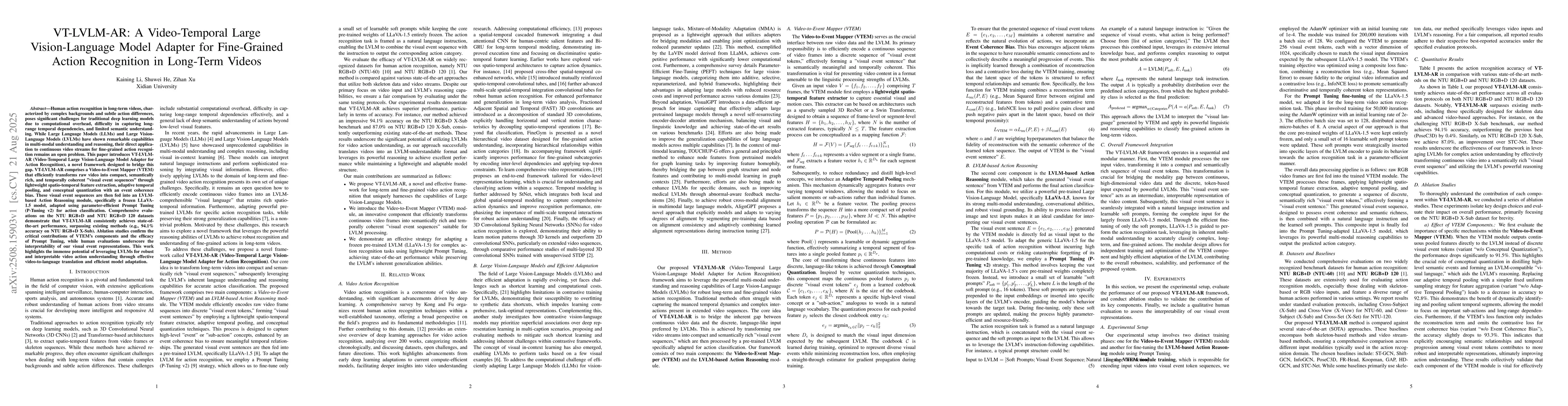 Human action recognition in long-term videos, characterized by complex backgrounds and subtle action differences, poses significant challenges for traditional deep learning models due to computational overhead, difficulty in capturing long-range temporal dependencies, and limited semantic understanding. While Large Language Models (LLMs) and Large Vision-Language Models (LVLMs) have shown remarkable capabilities in multi-modal understanding and reasoning, their direct application to continuous video streams for fine-grained action recognition remains an open problem. This paper introduces VT-LVLM-AR (Video-Temporal Large Vision-Language Model Adapter for Action Recognition), a novel framework designed to bridge this gap. VT-LVLM-AR comprises a Video-to-Event Mapper (VTEM) that efficiently transforms raw video into compact, semantically rich, and temporally coherent "visual event sequences" through lightweight spatio-temporal feature extraction, adaptive temporal pooling, and conceptual quantization with an event coherence bias. These visual event sequences are then fed into an LVLM-based Action Reasoning module, specifically a frozen LLaVA-1.5 model, adapted using parameter-efficient Prompt Tuning (P-Tuning v2) for action classification. Comprehensive evaluations on the NTU RGB+D and NTU RGB+D 120 datasets demonstrate that VT-LVLM-AR consistently achieves state-of-the-art performance, surpassing existing methods (e.g., 94.1% accuracy on NTU RGB+D X-Sub). Ablation studies confirm the critical contributions of VTEM's components and the efficacy of Prompt Tuning, while human evaluations underscore the interpretability of our visual event representations. This work highlights the immense potential of leveraging LVLMs for robust and interpretable video action understanding through effective video-to-language translation and efficient model adaptation.