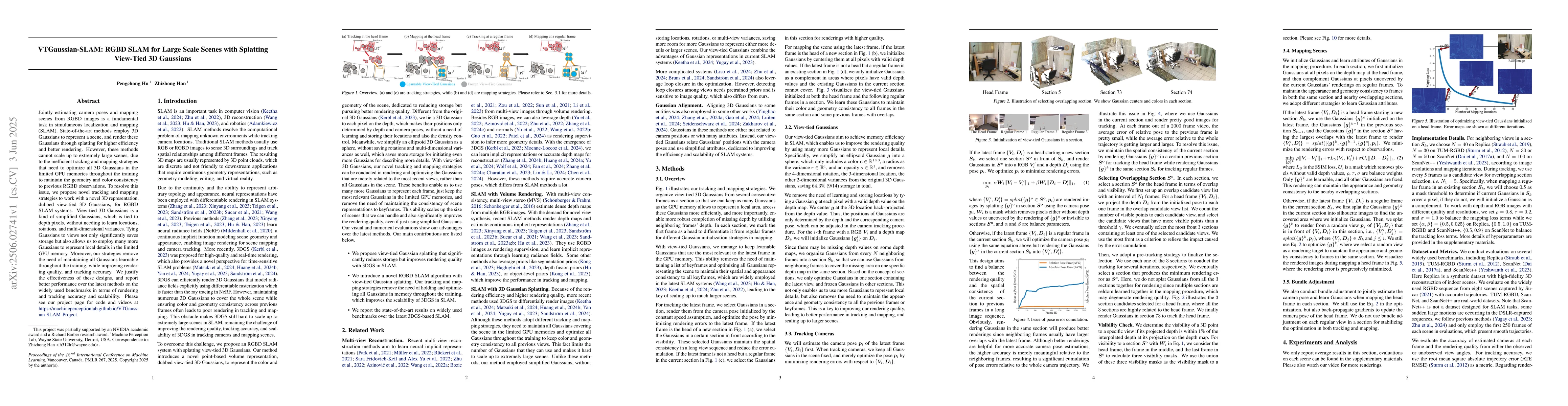 Jointly estimating camera poses and mapping scenes from RGBD images is a fundamental task in simultaneous localization and mapping (SLAM). State-of-the-art methods employ 3D Gaussians to represent a scene, and render these Gaussians through splatting for higher efficiency and better rendering. However, these methods cannot scale up to extremely large scenes, due to the inefficient tracking and mapping strategies that need to optimize all 3D Gaussians in the limited GPU memories throughout the training to maintain the geometry and color consistency to previous RGBD observations. To resolve this issue, we propose novel tracking and mapping strategies to work with a novel 3D representation, dubbed view-tied 3D Gaussians, for RGBD SLAM systems. View-tied 3D Gaussians is a kind of simplified Gaussians, which is tied to depth pixels, without needing to learn locations, rotations, and multi-dimensional variances. Tying Gaussians to views not only significantly saves storage but also allows us to employ many more Gaussians to represent local details in the limited GPU memory. Moreover, our strategies remove the need of maintaining all Gaussians learnable throughout the training, while improving rendering quality, and tracking accuracy. We justify the effectiveness of these designs, and report better performance over the latest methods on the widely used benchmarks in terms of rendering and tracking accuracy and scalability. Please see our project page for code and videos at https://machineperceptionlab.github.io/VTGaussian-SLAM-Project .