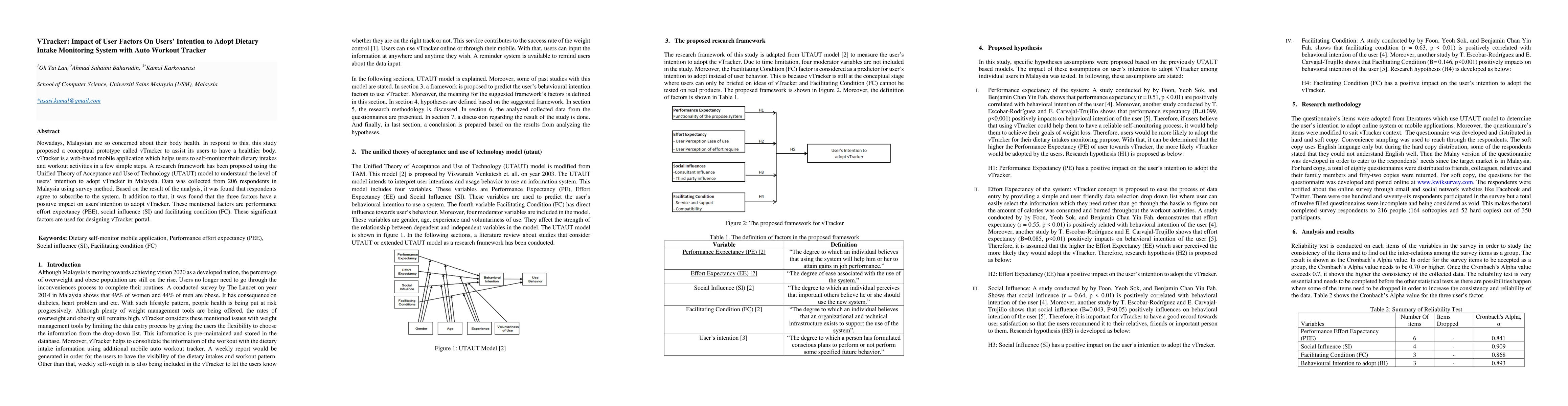 This study introduces vTracker, a web-based mobile app to help Malaysians monitor dietary intake and workout activities, using the UTAUT model to gauge adoption intention. Findings from 206 respondents indicate a positive intention to adopt vTracker, driven by performance expectancy, social influence, and facilitating conditions.