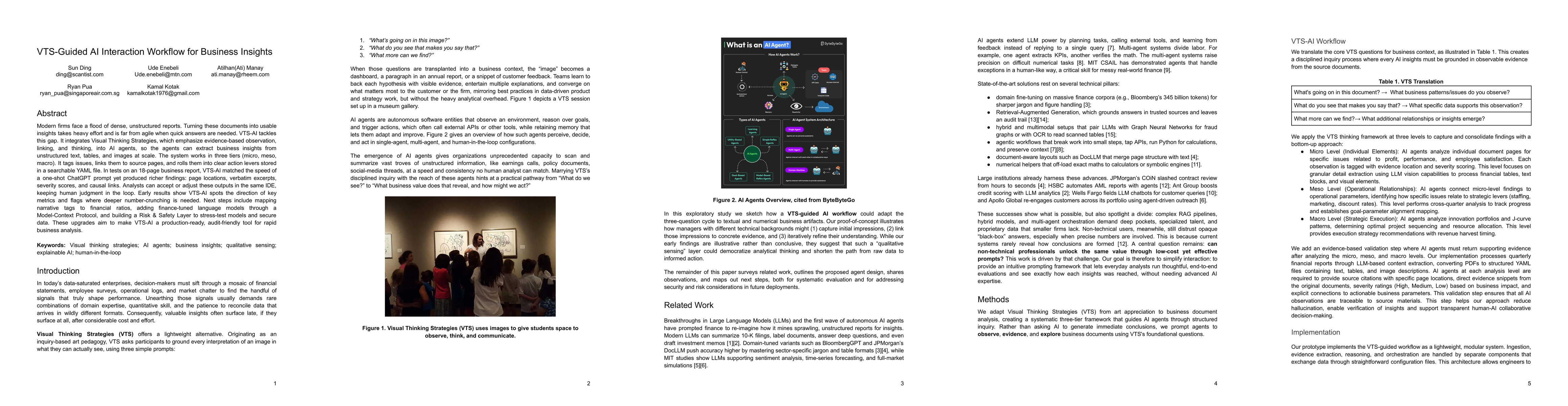 Modern firms face a flood of dense, unstructured reports. Turning these documents into usable insights takes heavy effort and is far from agile when quick answers are needed. VTS-AI tackles this gap. It integrates Visual Thinking Strategies, which emphasize evidence-based observation, linking, and thinking, into AI agents, so the agents can extract business insights from unstructured text, tables, and images at scale. The system works in three tiers (micro, meso, macro). It tags issues, links them to source pages, and rolls them into clear action levers stored in a searchable YAML file. In tests on an 18-page business report, VTS-AI matched the speed of a one-shot ChatGPT prompt yet produced richer findings: page locations, verbatim excerpts, severity scores, and causal links. Analysts can accept or adjust these outputs in the same IDE, keeping human judgment in the loop. Early results show VTS-AI spots the direction of key metrics and flags where deeper number-crunching is needed. Next steps include mapping narrative tags to financial ratios, adding finance-tuned language models through a Model-Context Protocol, and building a Risk & Safety Layer to stress-test models and secure data. These upgrades aim to make VTS-AI a production-ready, audit-friendly tool for rapid business analysis.