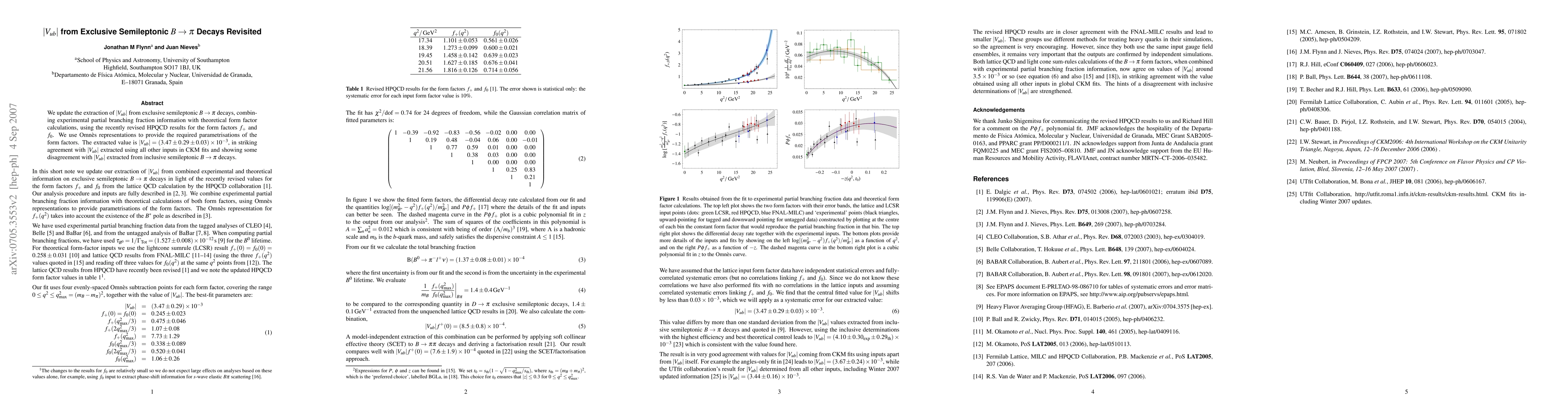 The paper presents an updated determination of |Vub| using exclusive B → πℓν decays, incorporating revised lattice QCD form factor calculations from HPQCD and employing Omnes parametrization.