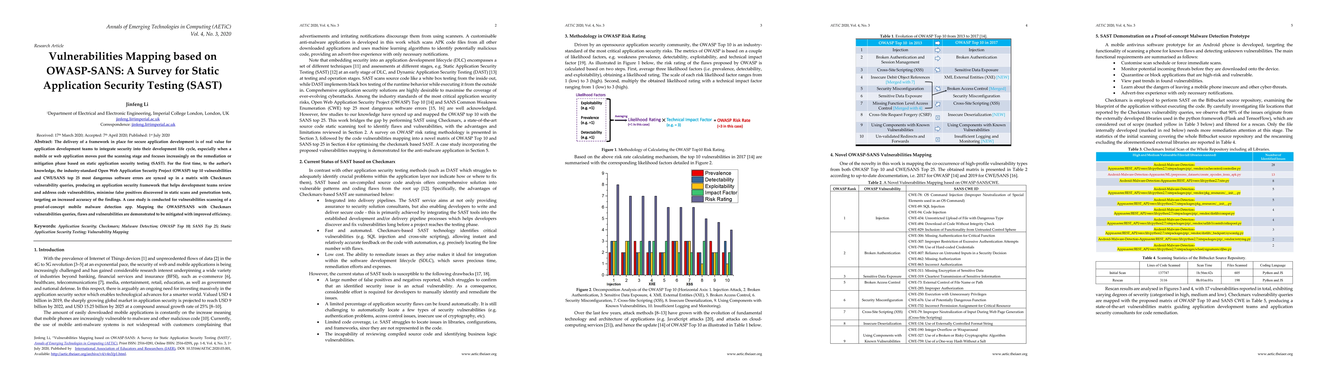 This paper presents a framework integrating OWASP and SANS top vulnerabilities with Checkmarx queries to enhance static application security testing (SAST). A case study on a mobile malware detection app shows improved efficiency and accuracy in vulnerability mitigation.