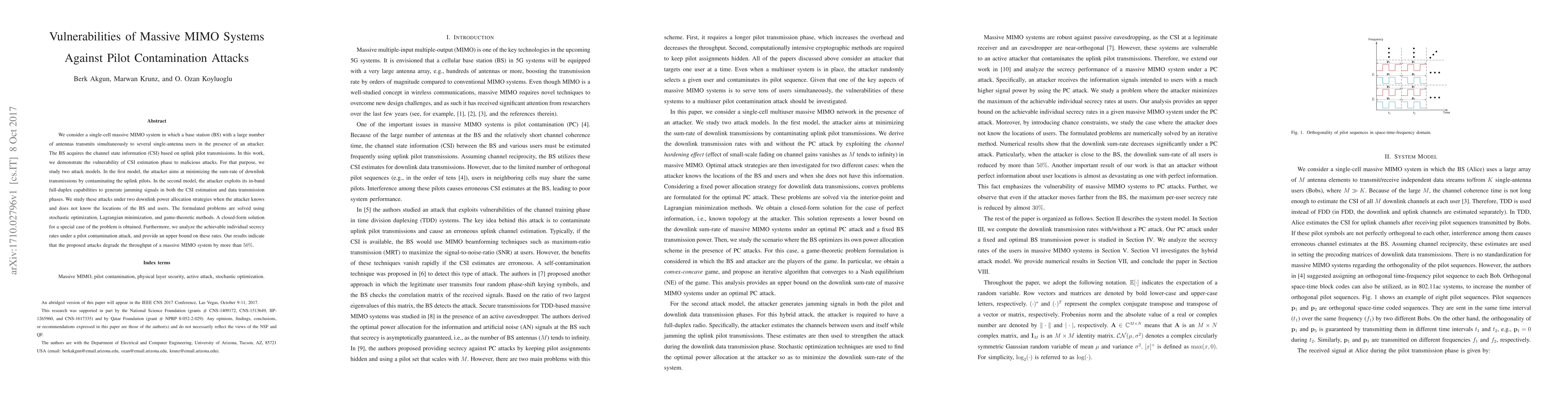 This paper investigates the vulnerabilities of massive MIMO systems to pilot contamination attacks, demonstrating how attackers can degrade system throughput by over 50% through two attack models: one targeting sum-rate minimization and the other using jamming signals. Solutions involve stochastic optimization and game theory.