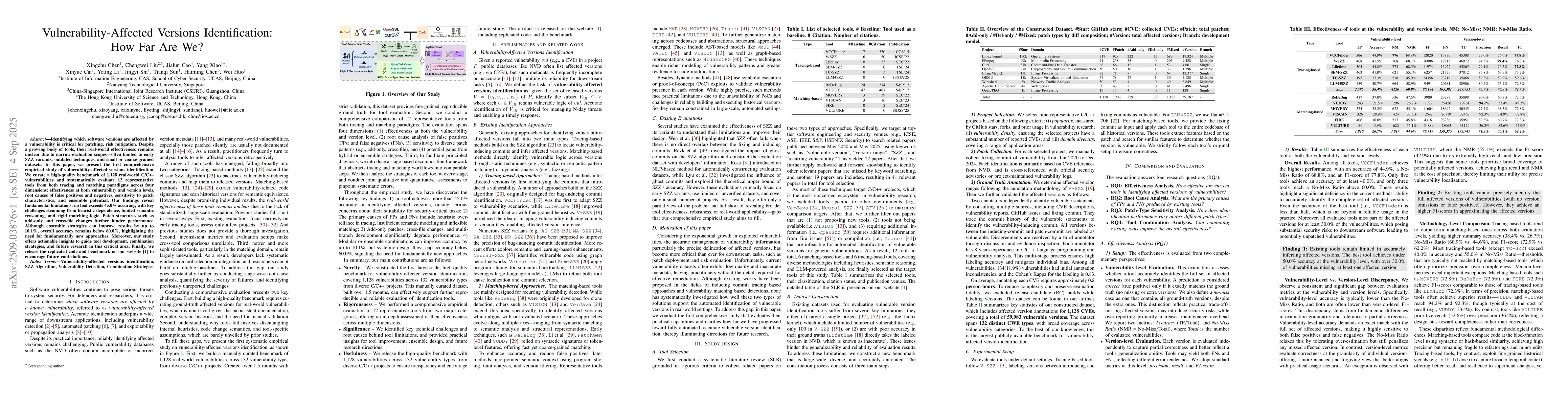 Identifying which software versions are affected by a vulnerability is critical for patching, risk mitigation.Despite a growing body of tools, their real-world effectiveness remains unclear due to narrow evaluation scopes often limited to early SZZ variants, outdated techniques, and small or coarse-graineddatasets. In this paper, we present the first comprehensive empirical study of vulnerability affected versions identification. We curate a high quality benchmark of 1,128 real-world C/C++ vulnerabilities and systematically evaluate 12 representative tools from both tracing and matching paradigms across four dimensions: effectiveness at both vulnerability and version levels, root causes of false positives and negatives, sensitivity to patch characteristics, and ensemble potential. Our findings reveal fundamental limitations: no tool exceeds 45.0% accuracy, with key challenges stemming from heuristic dependence, limited semantic reasoning, and rigid matching logic. Patch structures such as add-only and cross-file changes further hinder performance. Although ensemble strategies can improve results by up to 10.1%, overall accuracy remains below 60.0%, highlighting the need for fundamentally new approaches. Moreover, our study offers actionable insights to guide tool development, combination strategies, and future research in this critical area. Finally, we release the replicated code and benchmark on our website to encourage future contributions.outdated techniques, and small or coarse grained datasets.