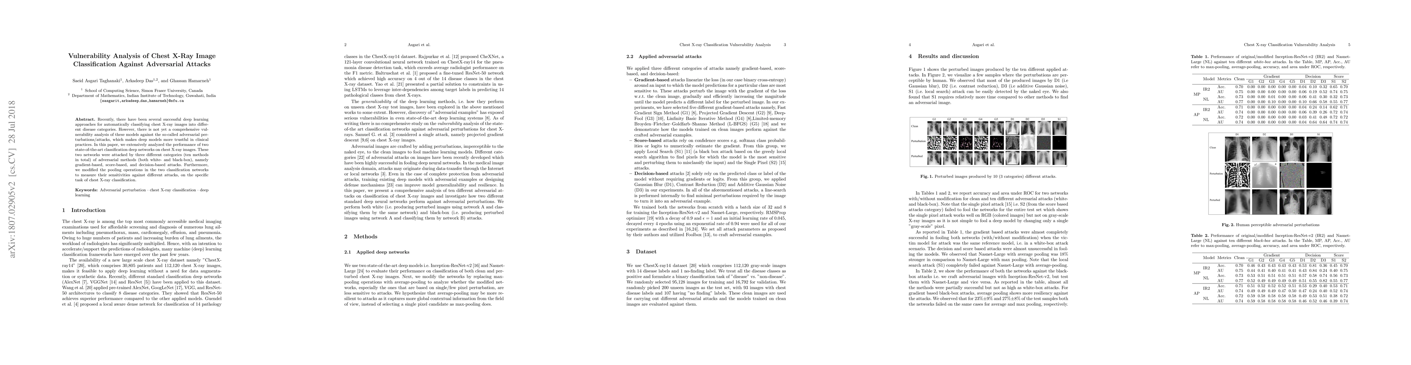 Recently, there have been several successful deep learning approaches for automatically classifying chest X-ray images into different disease categories. However, there is not yet a comprehensive vulnerability analysis of these models against the so-called adversarial perturbations/attacks, which makes deep models more trustful in clinical practices. In this paper, we extensively analyzed the performance of two state-of-the-art classification deep networks on chest X-ray images. These two networks were attacked by three different categories (ten methods in total) of adversarial methods (both white- and black-box), namely gradient-based, score-based, and decision-based attacks. Furthermore, we modified the pooling operations in the two classification networks to measure their sensitivities against different attacks, on the specific task of chest X-ray classification.