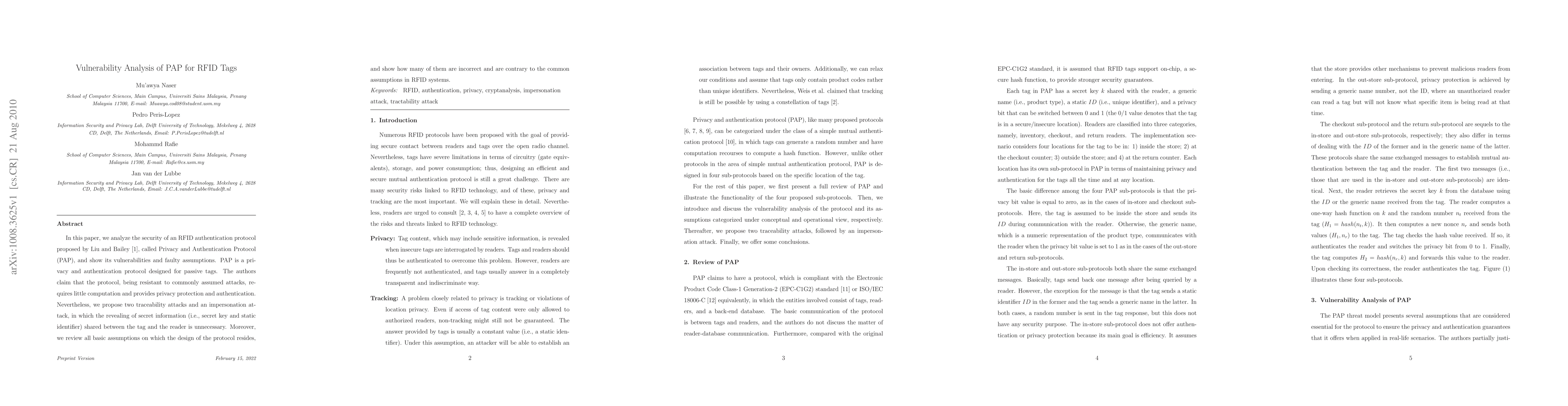 In this paper, we analyze the security of an RFID authentication protocol proposed by Liu and Bailey [1], called Privacy and Authentication Protocol (PAP), and show its vulnerabilities and faulty assumptions. PAP is a privacy and authentication protocol designed for passive tags. The authors claim that the protocol, being resistant to commonly assumed attacks, requires little computation and provides privacy protection and authentication. Nevertheless, we propose two traceability attacks and an impersonation attack, in which the revealing of secret information (i.e., secret key and static identifier) shared between the tag and the reader is unnecessary. Moreover, we review all basic assumptions on which the design of the protocol resides, and show how many of them are incorrect and are contrary to the common assumptions in RFID systems.