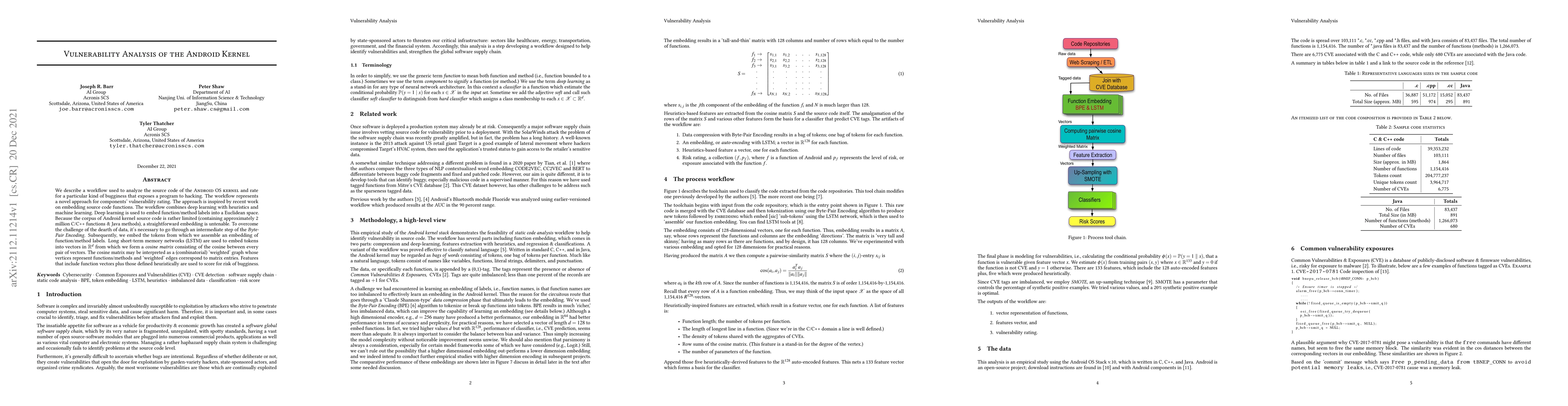 This paper presents a novel workflow for vulnerability analysis of the Android kernel source code, combining deep learning and heuristics to rate components for hacking risk. It uses Byte-Pair Encoding and LSTM embeddings to handle the limited data, followed by a cosine matrix for graph-based analysis and risk scoring.