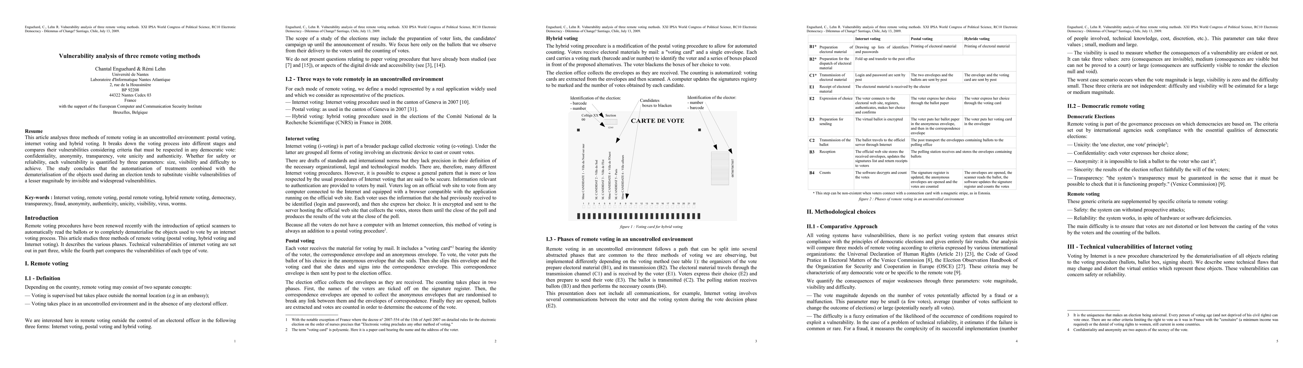 A study analyzes three remote voting methods (postal, internet, and hybrid) and finds that automation substitutes visible vulnerabilities with invisible ones, affecting confidentiality, anonymity, transparency, and authenticity.