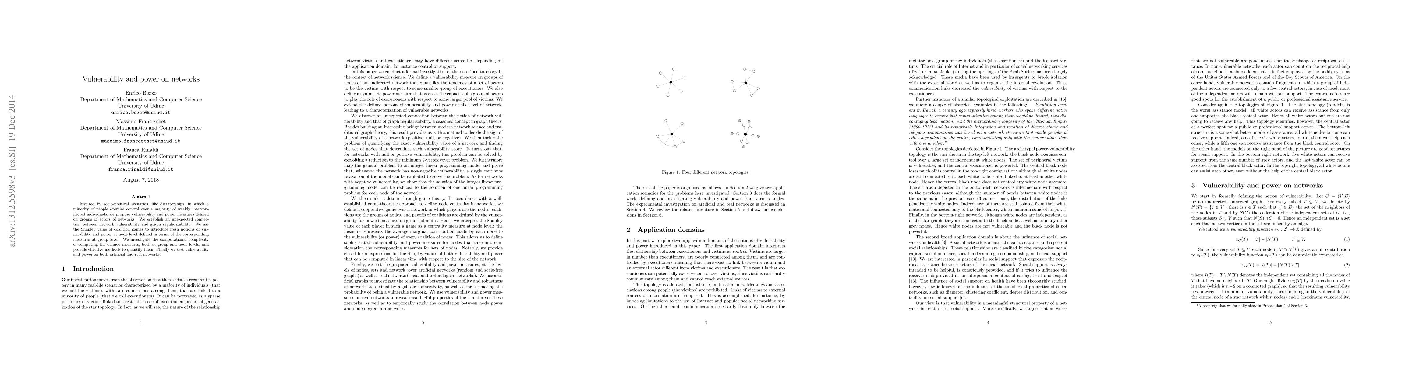 Inspired by socio-political scenarios, like dictatorships, in which a minority of people exercise control over a majority of weakly interconnected individuals, we propose vulnerability and power measures defined on groups of actors of networks. We establish an unexpected connection between network vulnerability and graph regularizability. We use the Shapley value of coalition games to introduce fresh notions of vulnerability and power at node level defined in terms of the corresponding measures at group level. We investigate the computational complexity of computing the defined measures, both at group and node levels, and provide effective methods to quantify them. Finally we test vulnerability and power on both artificial and real networks.