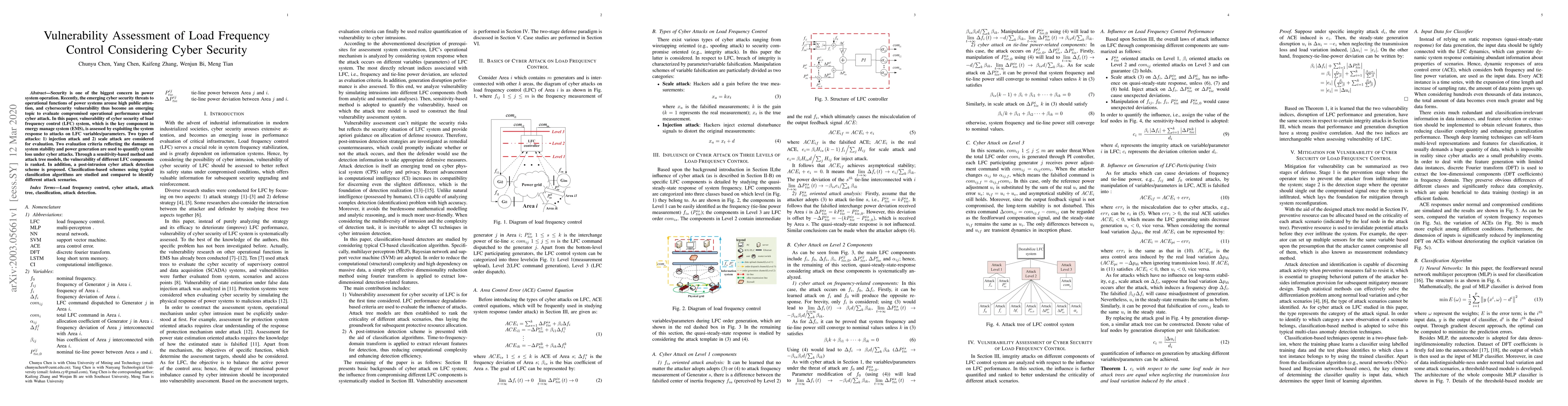 This paper assesses the vulnerability of load frequency control (LFC) systems to cyber security threats, evaluating the impact of injection and scale attacks on system stability and power generation. It proposes a post-intrusion detection scheme using classification algorithms to identify attack scenarios.