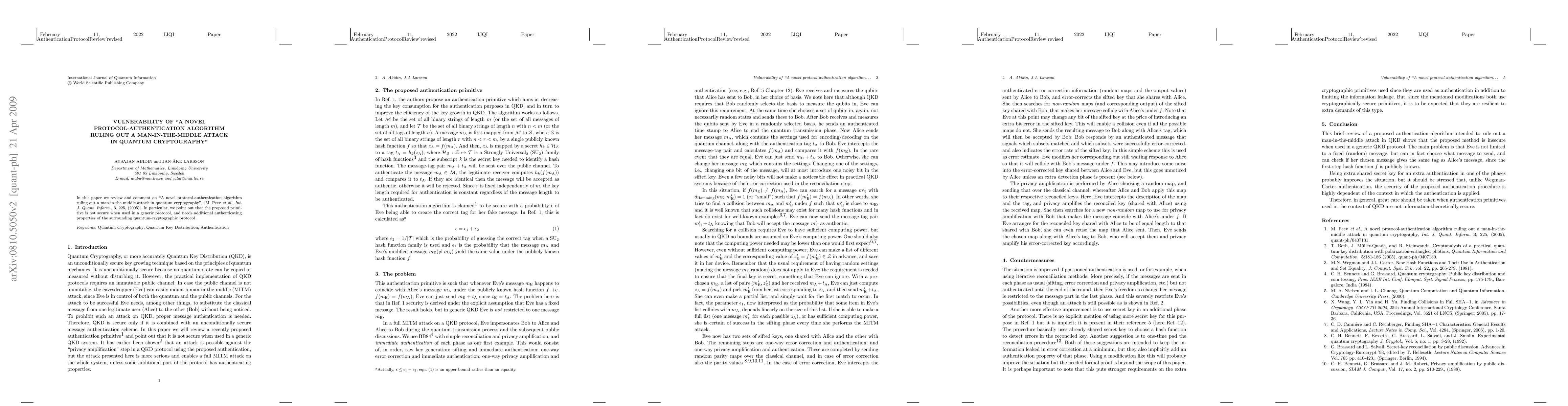 In this paper we review and comment on "A novel protocol-authentication algorithm ruling out a man-in-the-middle attack in quantum cryptography", [M. Peev et al., Int. J. Quant. Inform., 3, 225, (2005)]. In particular, we point out that the proposed primitive is not secure when used in a generic protocol, and needs additional authenticating properties of the surrounding quantum-cryptographic protocol.