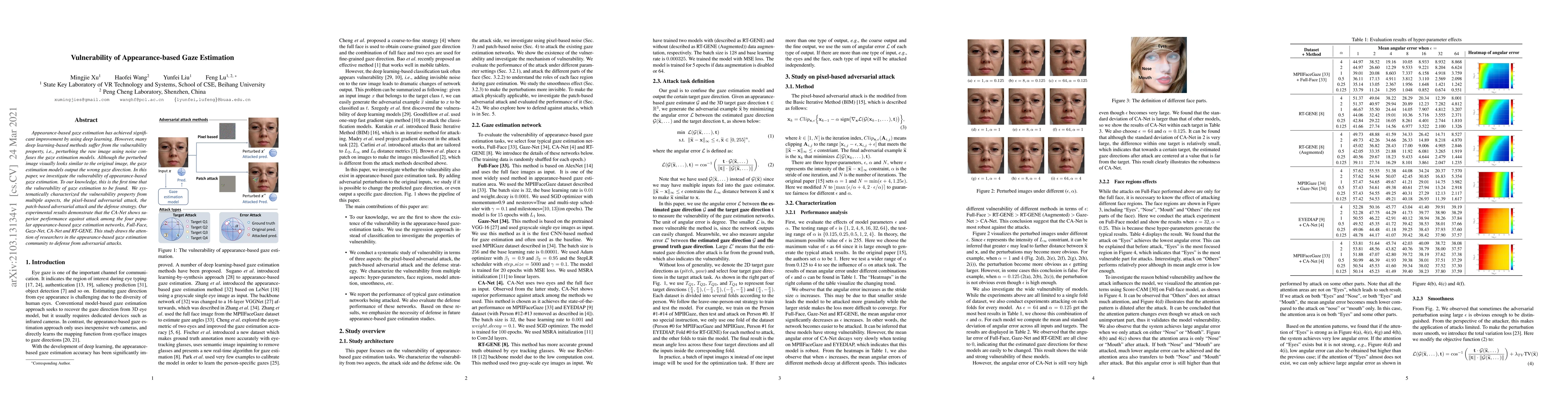 Appearance-based gaze estimation has achieved significant improvement by using deep learning. However, many deep learning-based methods suffer from the vulnerability property, i.e., perturbing the raw image using noise confuses the gaze estimation models. Although the perturbed image visually looks similar to the original image, the gaze estimation models output the wrong gaze direction. In this paper, we investigate the vulnerability of appearance-based gaze estimation. To our knowledge, this is the first time that the vulnerability of gaze estimation to be found. We systematically characterized the vulnerability property from multiple aspects, the pixel-based adversarial attack, the patch-based adversarial attack and the defense strategy. Our experimental results demonstrate that the CA-Net shows superior performance against attack among the four popular appearance-based gaze estimation networks, Full-Face, Gaze-Net, CA-Net and RT-GENE. This study draws the attention of researchers in the appearance-based gaze estimation community to defense from adversarial attacks.