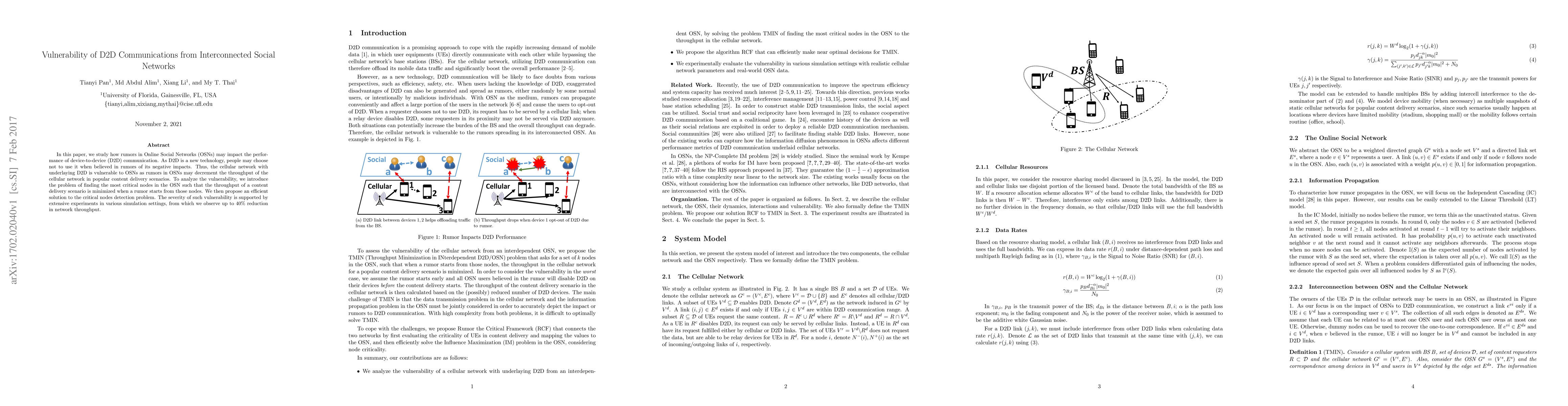 In this paper, we study how rumors in Online Social Networks (OSNs) may impact the performance of device-to-device (D2D) communication. As D2D is a new technology, people may choose not to use it when believed in rumors of its negative impacts. Thus, the cellular network with underlaying D2D is vulnerable to OSNs as rumors in OSNs may decrement the throughput of the cellular network in popular content delivery scenarios. To analyze the vulnerability, we introduce the problem of finding the most critical nodes in the OSN such that the throughput of a content delivery scenario is minimized when a rumor starts from those nodes. We then propose an efficient solution to the critical nodes detection problem. The severity of such vulnerability is supported by extensive experiments in various simulation settings, from which we observe up to $40\%$ reduction in network throughput.
