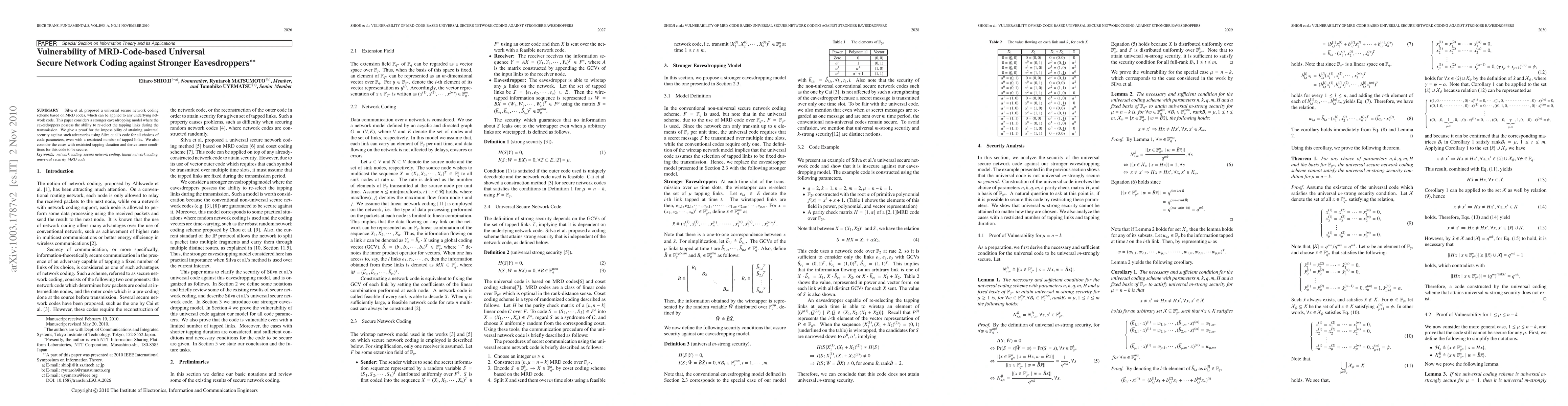 This paper demonstrates that Silva et al.'s MRD-code-based universal secure network coding scheme cannot achieve universal security against stronger eavesdroppers who can re-select tapping links. It concludes that the scheme is not universally secure under such conditions, though it identifies scenarios with restricted tapping duration where security can be maintained.