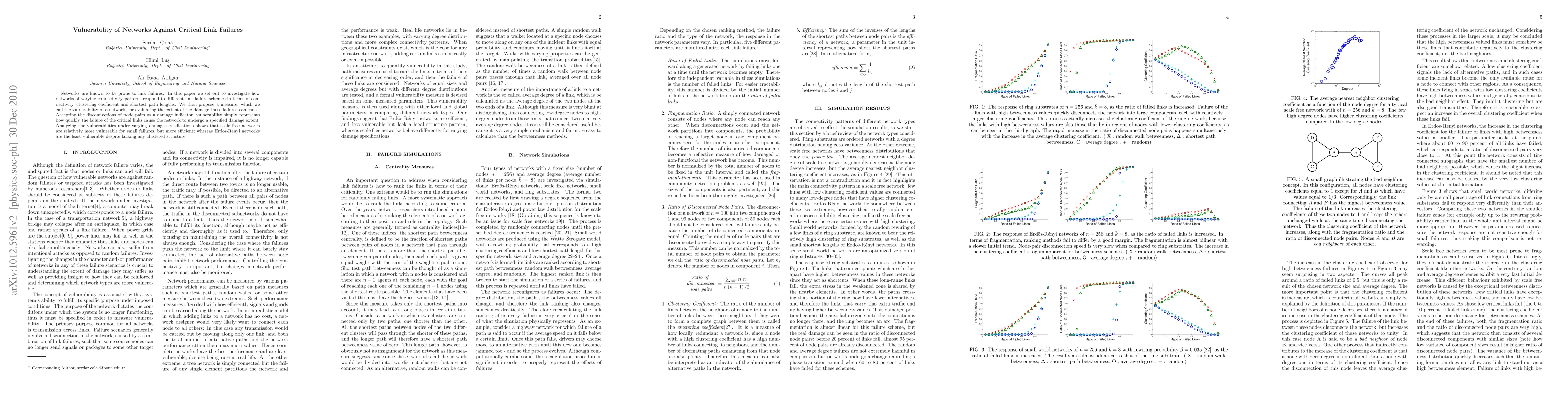 This paper investigates how different network types respond to link failures, finding that scale-free networks are more vulnerable but efficient, while Erd"os-R"enyi networks are less vulnerable despite lacking clustered structure.