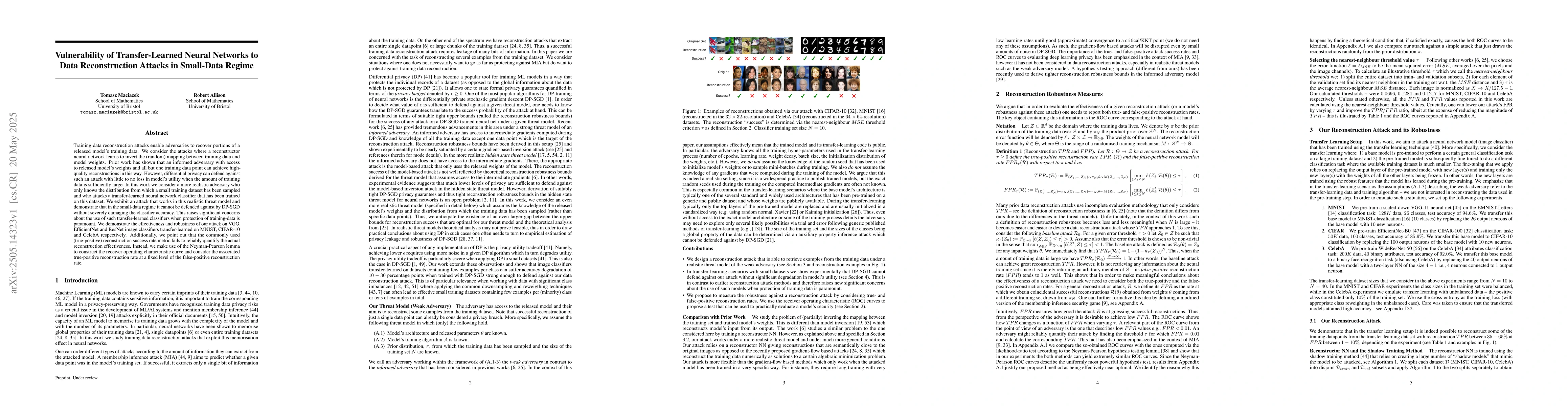 The paper presents a novel data reconstruction attack method targeting transfer-learned neural networks in the small-data regime and critiques the existing reconstruction success rate metric, proposing an alternative based on the Neyman-Pearson lemma.