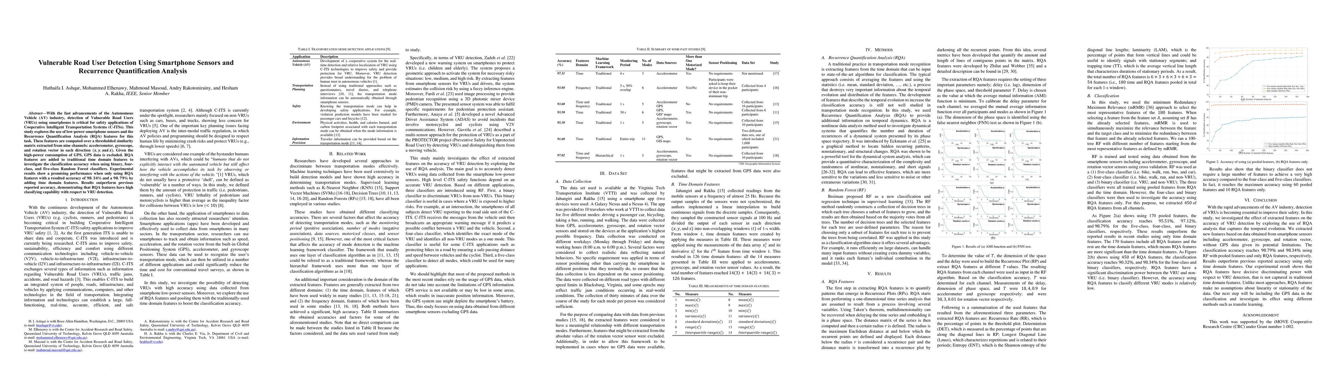 This study investigates the use of smartphone sensors and Recurrence Quantification Analysis (RQA) to detect Vulnerable Road Users (VRUs) for Autonomous Vehicle safety. RQA features, derived from accelerometer, gyroscope, and rotation vector data, combined with traditional time domain features, achieve high classification accuracy, outperforming previous methods.