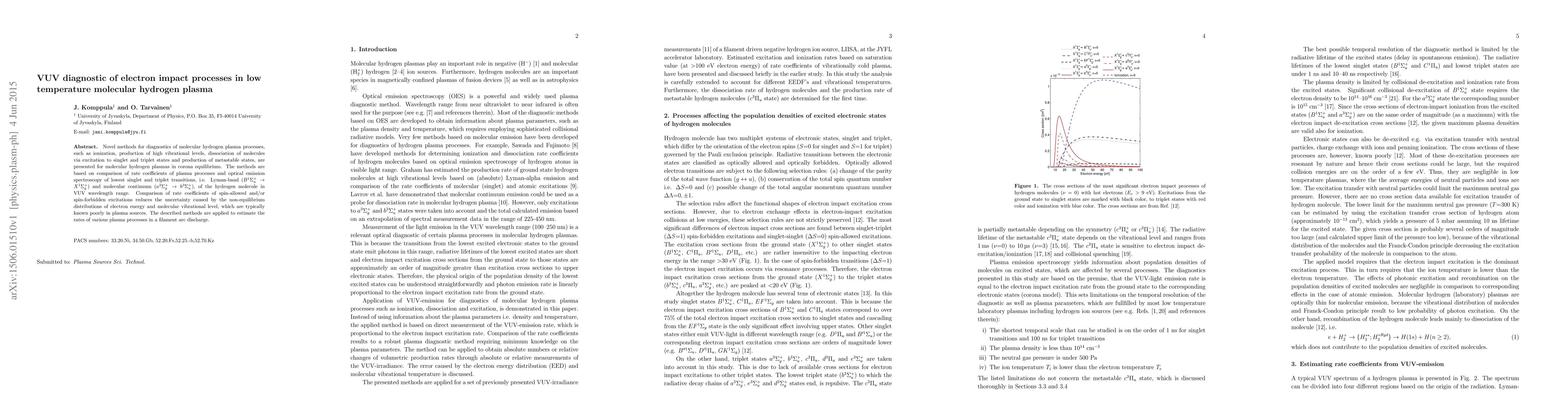This paper introduces novel diagnostic methods for molecular hydrogen plasma processes using VUV spectroscopy, focusing on ionization, vibrational excitation, and dissociation. The methods leverage optical emission spectroscopy to compare rate coefficients, reducing uncertainties in electron and vibrational distributions.