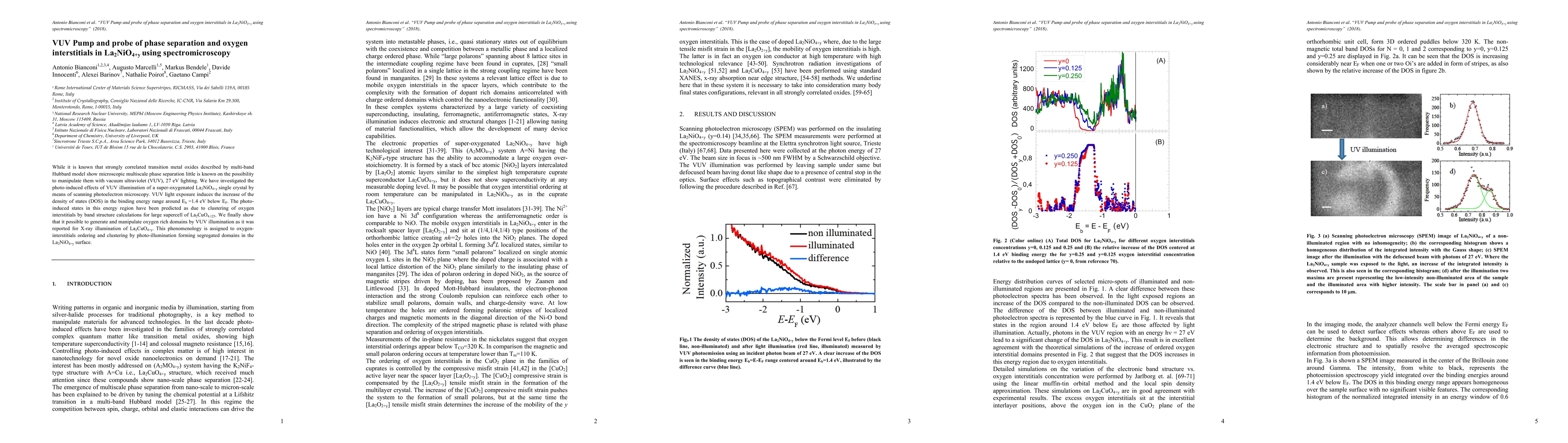 While it is known that strongly correlated transition metal oxides described by multi-band Hubbard model show microscopic multiscale phase separation little is known on the possibility to manipulate them with vacuum ultraviolet (VUV) 27 eV lighting. We have investigated the photo-induced effects of VUV illumination of a super-oxygenated La2NiO4+y single crystal by means of scanning photoelectron microscopy. VUV light exposure induces the increase of the density of states (DOS) in the binding energy range around Eb =1.4 eV below EF. The photo-induced states in this energy region have been predicted as due to clustering of oxygen interstitials by band structure calculations for large supercell of La2CuO4.125. We finally show that it possible to generate and manipulate oxygen rich domains by VUV illumination as it was reported for X-ray illumination of La2CuO4+y. This phenomenology is assigned to oxygen-interstitials ordering and clustering by photo-illumination forming segregated domains in the La2NiO4+y surface