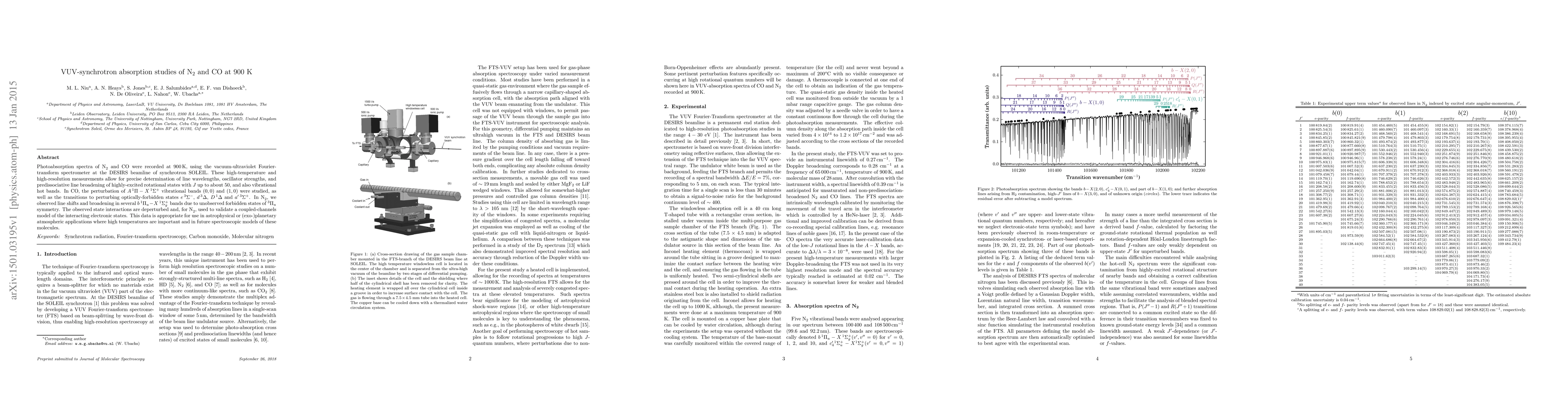 Photoabsorption spectra of N$_2$ and CO were recorded at 900K, using the vacuum-ultraviolet Fourier-transform spectrometer at the DESIRS beamline of synchrotron SOLEIL. These high-temperature and high-resolution measurements allow for precise determination of line wavelengths, oscillator strengths, and predissociative line broadening of highly-excited rotational states with $J$ up to about 50, and also vibrational hot bands. In CO, the perturbation of $A\,{}^1\Pi-X\,{}^1\Sigma^+$ vibrational bands $(0,0)$ and $(1,0)$ were studied, as well as the transitions to perturbing optically-forbidden states $e\,{}^3\Sigma^-$, $d\,{}^3\Delta$, $D\,{}^1\Delta$ and $a'\,{}^3\Sigma^+$. In N$_2$, we observed line shifts and broadening in several $b\,{}^1\Pi_u-X\,{}^1\Sigma^+_g$ bands due to unobserved forbidden states of ${}^3\Pi_u$ symmetry. The observed state interactions are deperturbed and, for N$_2$, used to validate a coupled-channels model of the interacting electronic states. This data is appropriate for use in astrophysical or (exo-)planetary atmospheric applications where high temperatures are important and in future spectroscopic models of these molecules.