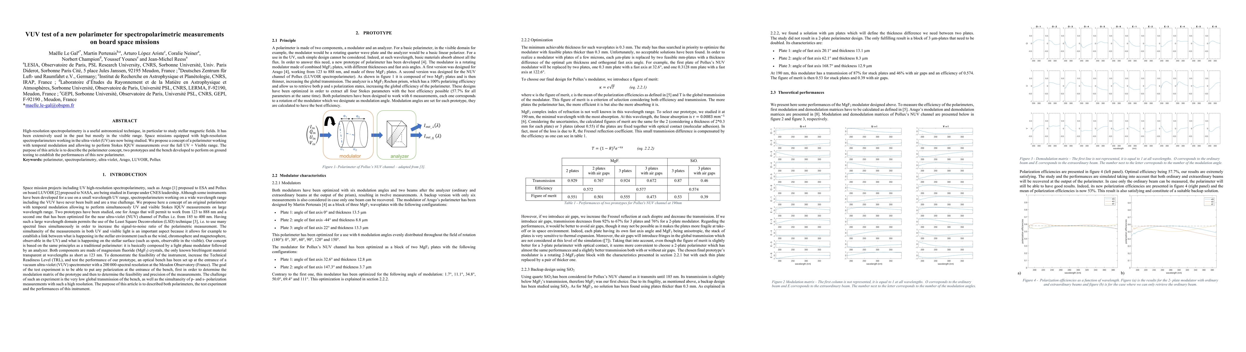 This paper proposes a new concept for a high-resolution polarimeter designed for spectropolarimetric measurements in the UV and visible range, utilizing temporal modulation. The study details two prototypes and a bench test setup to evaluate the performance of the new polarimeter for potential space missions.