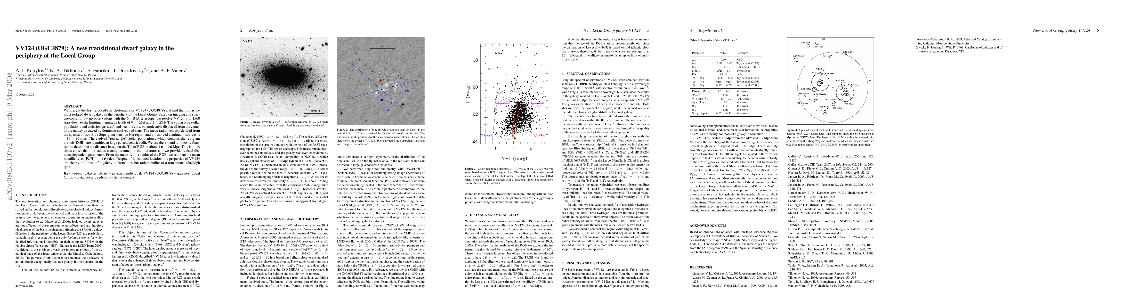 We present the first resolved-star photometry of VV124 (UGC4879) and find that this is the most isolated dwarf galaxy in the periphery of the Local Group. Based on imaging and spectroscopic follow up observations with the 6m BTA telescope, we resolve VV124 into 1560 stars down to the limiting magnitude levels of V~25.6 and I~23.9. The young blue stellar populations and emission gas are found near the core, but noticeably displaced from the center of the galaxy as traced by dominant evolved red stars. The mean radial velocity derived from the spectra of two Blue Supergiant stars, an HII region and unresolved continuum sources is -80+/-10 km/s. The evolved ``red tangle'' stellar populations, which contains the red giant branch (RGB), are identified at large galactocentric radii. We use the I-band luminosity function to determine the distance based on the Tip of RGB method, 1.1+/-0.1 Mpc. This is ~10 times closer than the values usually assumed in the literature, and we provide revised distance dependent parameters. From the mean (V-I) color of the RGB, we estimate the mean metallicity as [Fe/H]~-1.37 dex. Despite of its isolated location, the properties of VV124 are clearly not those of a galaxy in formation, but rather similar to a transitional dIrr/dSph type.