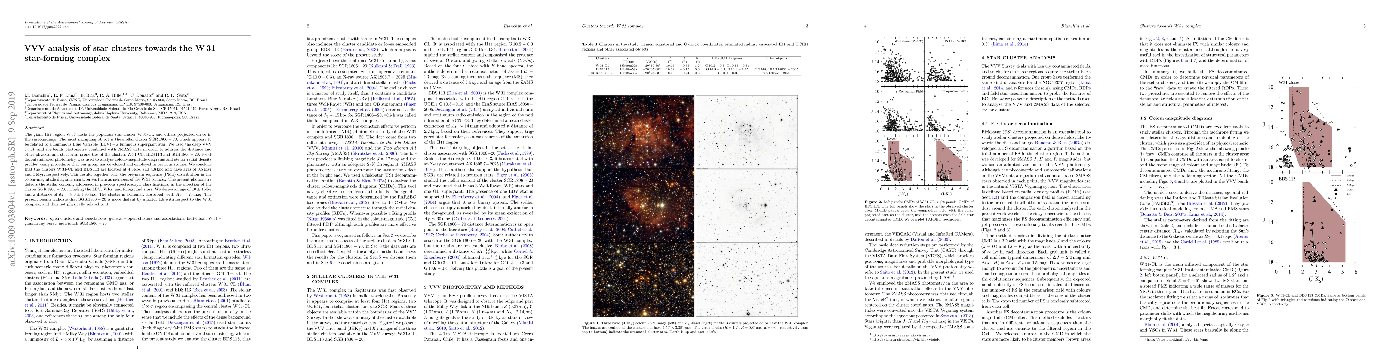 The paper analyzes star clusters in the W31 star-forming complex using VVV photometry, determining their distances, ages, and physical properties. It finds that SGR1806-20 is more distant from the W31 complex than initially thought, ruling out its connection to it.