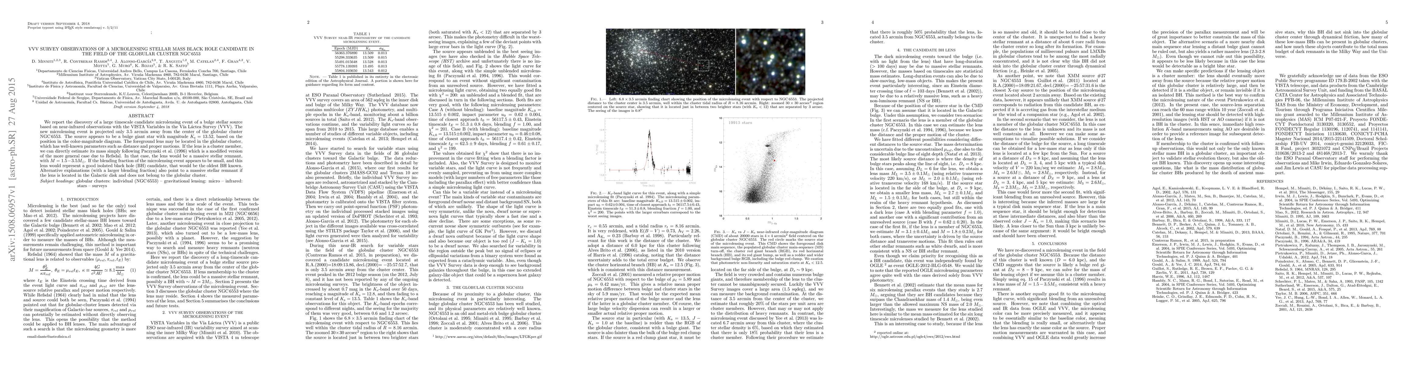 We report the discovery of a large timescale candidate microlensing event of a bulge stellar source based on near-infrared observations with the VISTA Variables in the Via Lactea Survey (VVV). The new microlensing event is projected only 3.5 arcmin away from the center of the globular cluster NGC 6553. The source appears to be a bulge giant star with magnitude Ks = 13.52, based on the position in the color-magnitude diagram. The foreground lens may be located in the globular cluster, which has well-known parameters such as distance and proper motions. If the lens is a cluster member, we can directly estimate its mass simply following Paczynski et al. (1996) which is a modified version of the more general case due to Refsdal. In that case, the lens would be a massive stellar remnant, with M = 1.5-3.5 Msun. If the blending fraction of the microlensing event appears to be small, and this lens would represent a good isolated black hole (BH) candidate, that would be the oldest BH known. Alternative explanations (with a larger blending fraction) also point to a massive stellar remnant if the lens is located in the Galactic disk and does not belong to the globular cluster.