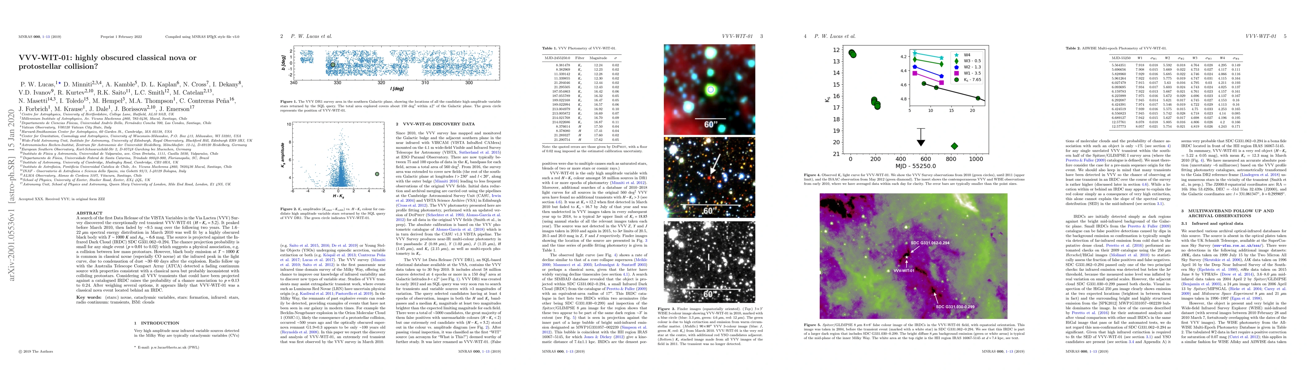 VVV-WIT-01 is an exceptionally red transient discovered in the VVV Survey, peaking before March 2010 and fading significantly over two years. Its spectral energy distribution suggests a highly obscured black body, initially hinting at a protostellar collision, but radio observations favor it being a classical nova behind an Infrared Dark Cloud.