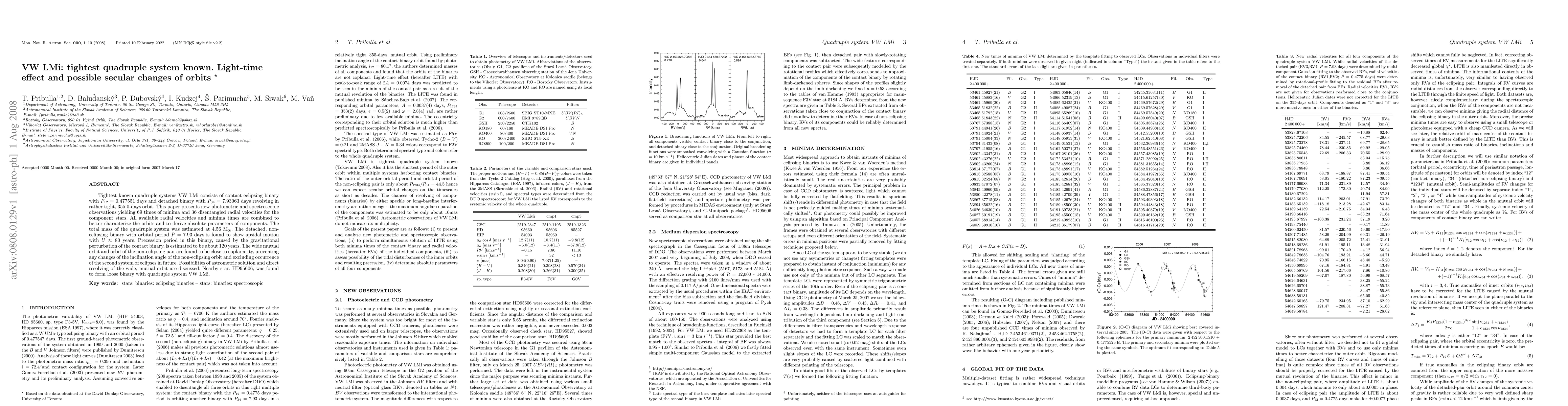 Tightest known quadruple systems VW LMi consists of contact eclipsing binary with P_12 = 0.477551 days and detached binary with P_34 = 7.93063 days revolving in rather tight, 355.0-days orbit. This paper presents new photometric and spectroscopic observations yielding 69 times of minima and 36 disentangled radial velocities for the component stars. All available radial velocities and minima times are combined to better characterize the orbits and to derive absolute parameters of components. The total mass of the quadruple system was estimated at 4.56 M_sun. The detached, non-eclipsing binary with orbital period P = 7.93 days is found to show apsidal motion with U approximately 80 years. Precession period in this binary, caused by the gravitational perturbation of the contact binary, is estimated to be about 120 years. The wide mutual orbit and orbit of the non-eclipsing pair are found to be close to coplanarity, preventing any changes of the inclination angle of the non-eclipsing orbit and excluding occurrence of the second system of eclipses in future. Possibilities of astrometric solution and direct resolving of the wide, mutual orbit are discussed. Nearby star, HD95606, was found to form loose binary with quadruple system VW LMi.