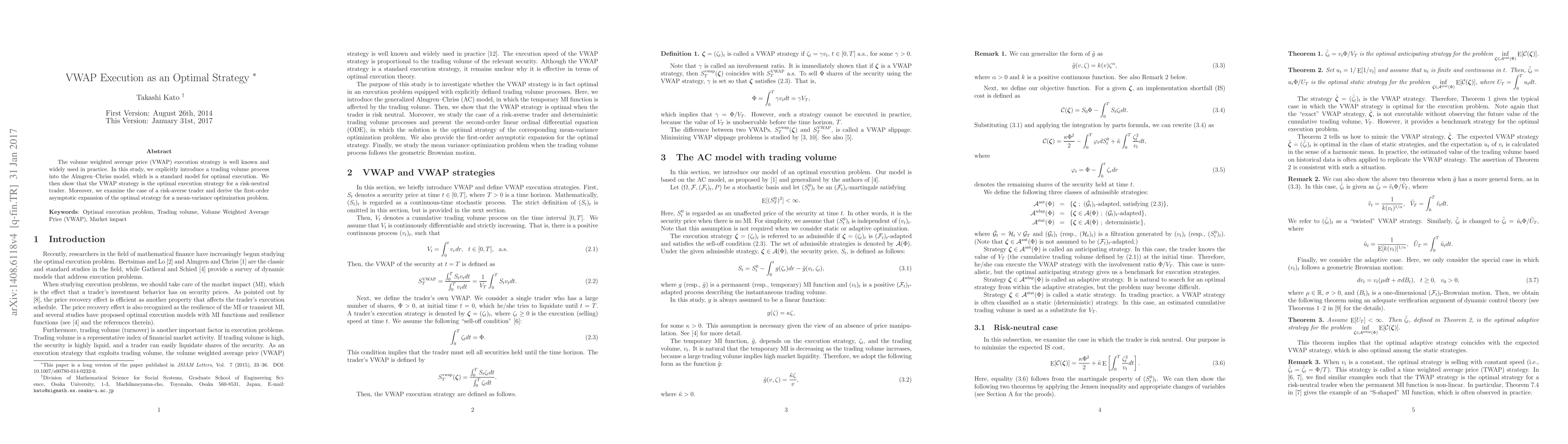 This paper demonstrates that VWAP execution is the optimal strategy for a risk-neutral trader within the Almgren-Chriss model. It also explores the optimal strategy for risk-averse traders, deriving the first-order asymptotic expansion for a mean-variance optimization problem.