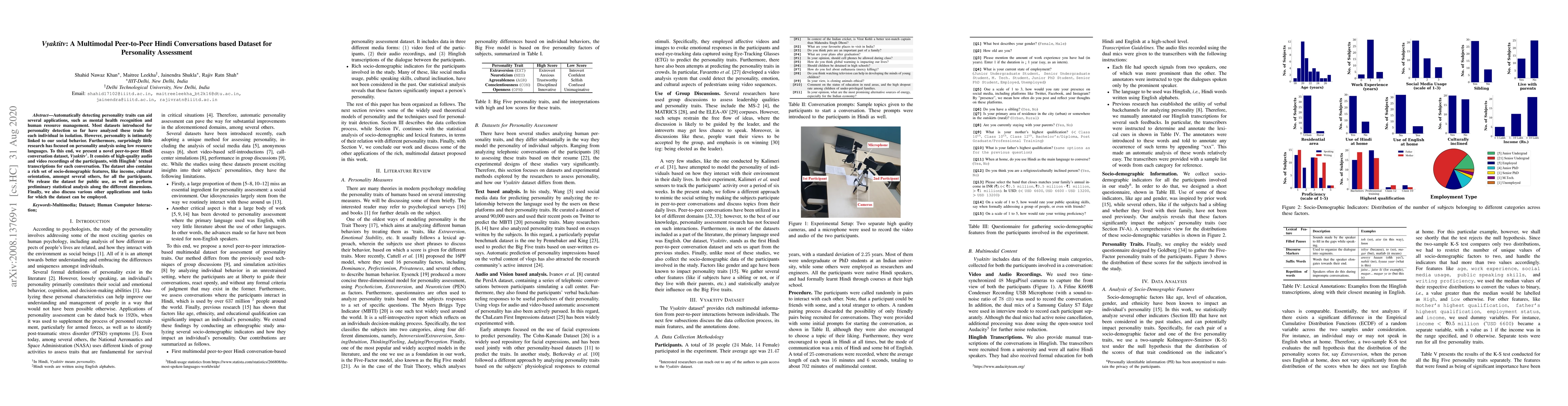 Automatically detecting personality traits can aid several applications, such as mental health recognition and human resource management. Most datasets introduced for personality detection so far have analyzed these traits for each individual in isolation. However, personality is intimately linked to our social behavior. Furthermore, surprisingly little research has focused on personality analysis using low resource languages. To this end, we present a novel peer-to-peer Hindi conversation dataset- Vyaktitv. It consists of high-quality audio and video recordings of the participants, with Hinglish textual transcriptions for each conversation. The dataset also contains a rich set of socio-demographic features, like income, cultural orientation, amongst several others, for all the participants. We release the dataset for public use, as well as perform preliminary statistical analysis along the different dimensions. Finally, we also discuss various other applications and tasks for which the dataset can be employed.
