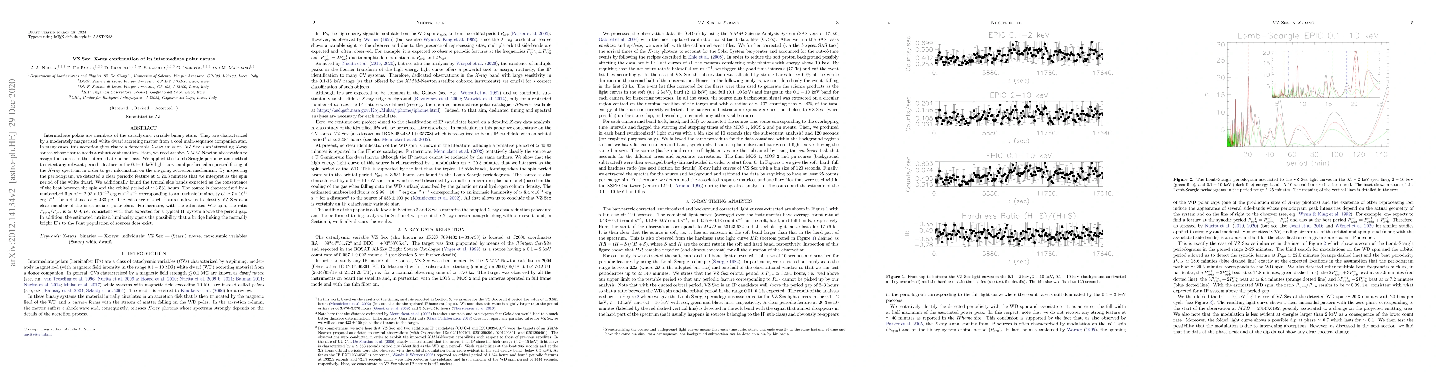 This paper confirms VZ Sex as an intermediate polar through XMM-Newton observations, identifying a spin period of approximately 20.3 minutes and a beat period indicative of the orbital period. The findings support its classification as an intermediate polar and suggest a potential link between bright and faint polars.