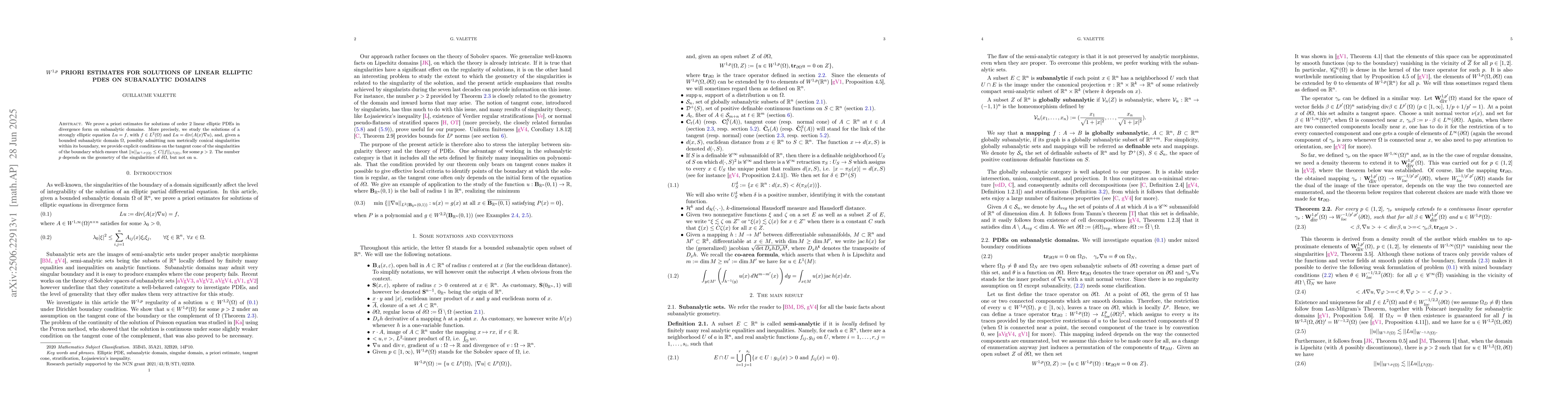 We prove a priori estimates for solutions of order $2$ linear elliptic PDEs in divergence form on subanalytic domains. More precisely, we study the solutions of a strongly elliptic equation $Lu=f$, with $f\in L^2(\mathcal{\Omega})$ and $Lu=div (A(x) \nabla u)$, and, given a bounded subanalytic domain $\mathcal{\Omega}$, possibly admitting non metrically conical singularities within its boundary, we provide explicit conditions on the tangent cone of the singularities of the boundary which ensure that $||u||_{ W^{1,p}(\mathcal{\Omega})}\le C||f||_{L^2(\mathcal{\Omega})}$, for some $p>2$. The number $p$ depends on the geometry of the singularities of $\delta \mathcal{\Omega}$, but not on $u$.