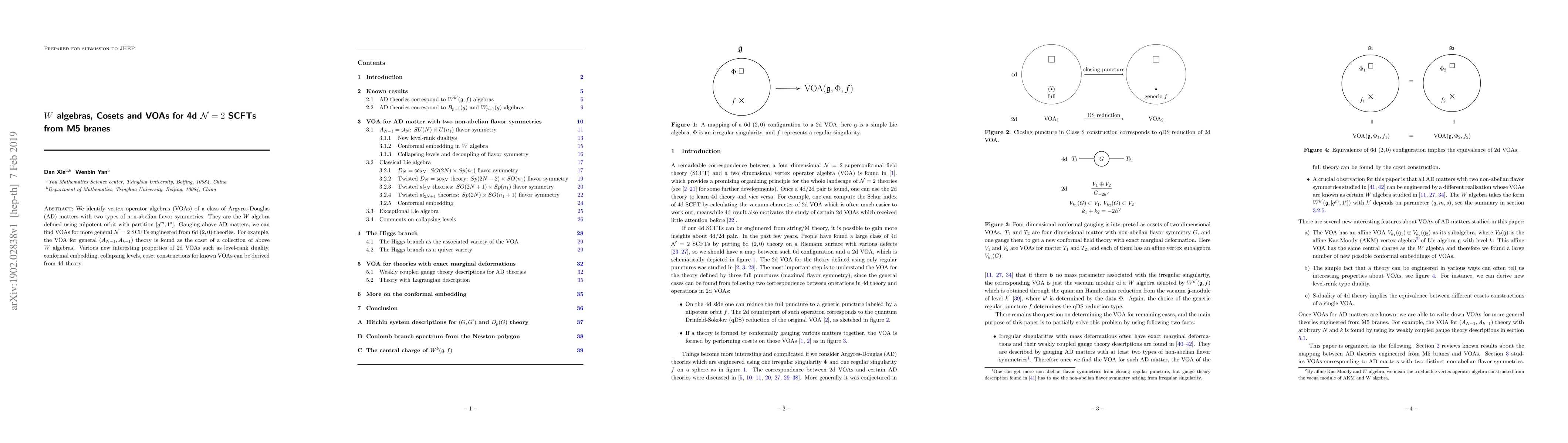 We identify vertex operator algebras (VOAs) of a class of Argyres-Douglas (AD) matters with two types of non-abelian flavor symmetries. They are the $W$ algebra defined using nilpotent orbit with partition $[q^m,1^s]$. Gauging above AD matters, we can find VOAs for more general $\mathcal{N}=2$ SCFTs engineered from 6d $(2,0)$ theories. For example, the VOA for general $(A_{N-1}, A_{k-1})$ theory is found as the coset of a collection of above $W$ algebras. Various new interesting properties of 2d VOAs such as level-rank duality, conformal embedding, collapsing levels, coset constructions for known VOAs can be derived from 4d theory.
