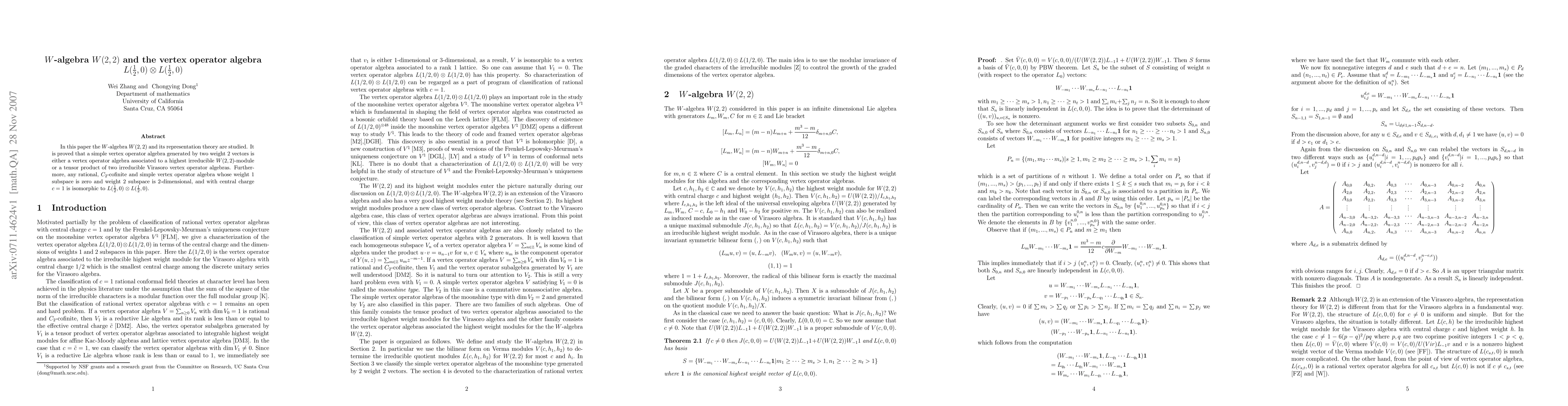 This paper explores the W-algebra W(2,2) and its representation theory, showing that a specific vertex operator algebra is either associated with a highest irreducible W(2,2)-module or a tensor product of two irreducible Virasoro algebras. It concludes that a rational, C_2-cofinite simple vertex operator algebra with certain weight subspace dimensions and central charge c=1 is isomorphic to L(1/2,0) ⊗ L(1/2,0).