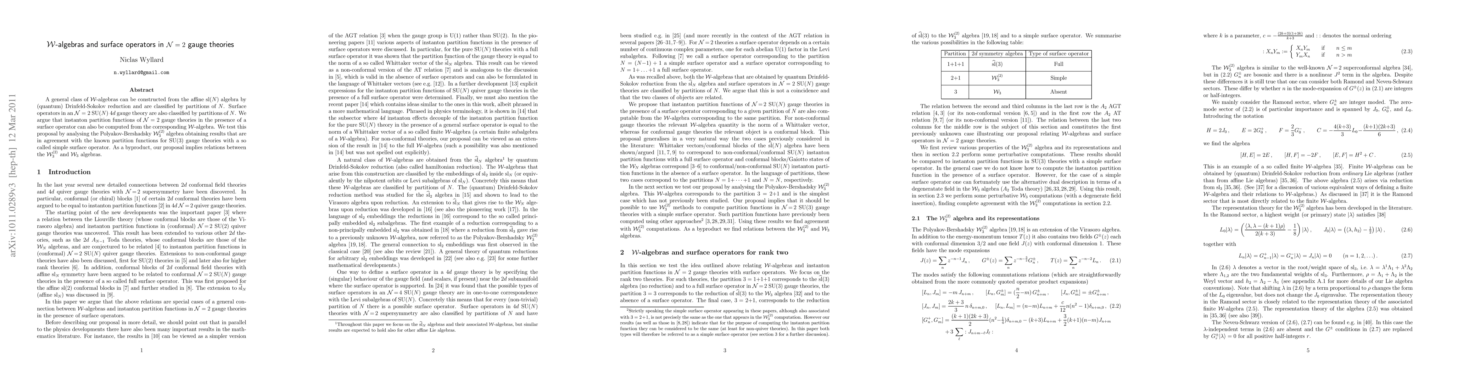 A general class of W-algebras can be constructed from the affine sl(N) algebra by (quantum) Drinfeld-Sokolov reduction and are classified by partitions of N. Surface operators in an N=2 SU(N) 4d gauge theory are also classified by partitions of N. We argue that instanton partition functions of N=2 gauge theories in the presence of a surface operator can also be computed from the corresponding W-algebra. We test this proposal by analysing the Polyakov-Bershadsky W_3^(2) algebra obtaining results that are in agreement with the known partition functions for SU(3) gauge theories with a so called simple surface operator. As a byproduct, our proposal implies relations between the W_3^(2) and W_3 algebras.